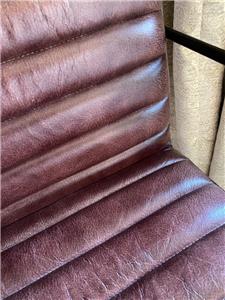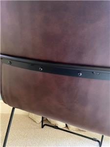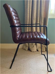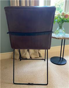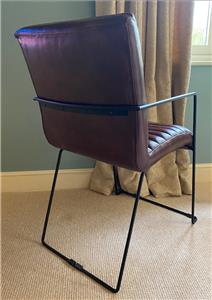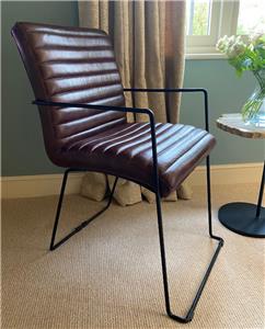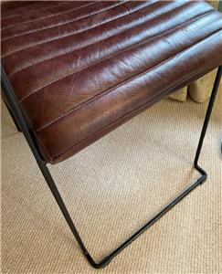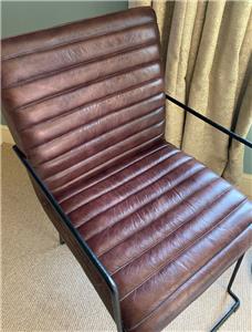This Stylish Occasional / Accent chair has a simple, refined industrial iron framework that supports a comfortably padded stitched ribbed leather seat and back. The warmth of the rich dark leather contrasts beautifully against the striking solid black rolled iron framework.
