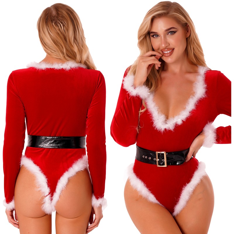 Women Christmas Outfits Feather Trimming Bodysuit Deep V Neck Long Sleeve Leotard with Belt.