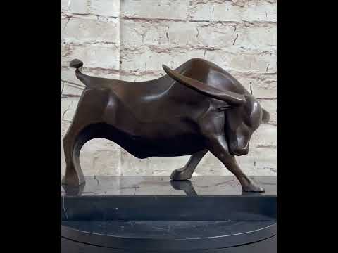 Capturing the raw power and intensity of a charging bull, this breathtaking sculpture portrays the animal in a moment of fiery determination and unbridled strength. With its head lowered, nostrils flared, and muscles taut, the bull prepares to face its adversary, emitting a primal grunt as it surveys the ground before it. The finely detailed horns, sturdy physique, and coiled tail convey a sense of controlled ferocity, highlighting the bull's formidable nature and tenacious spirit. Crafted with meticulous attention to detail, this bronze masterpiece is a testament to the artist's skill and dedication to capturing the essence of this magnificent creature.