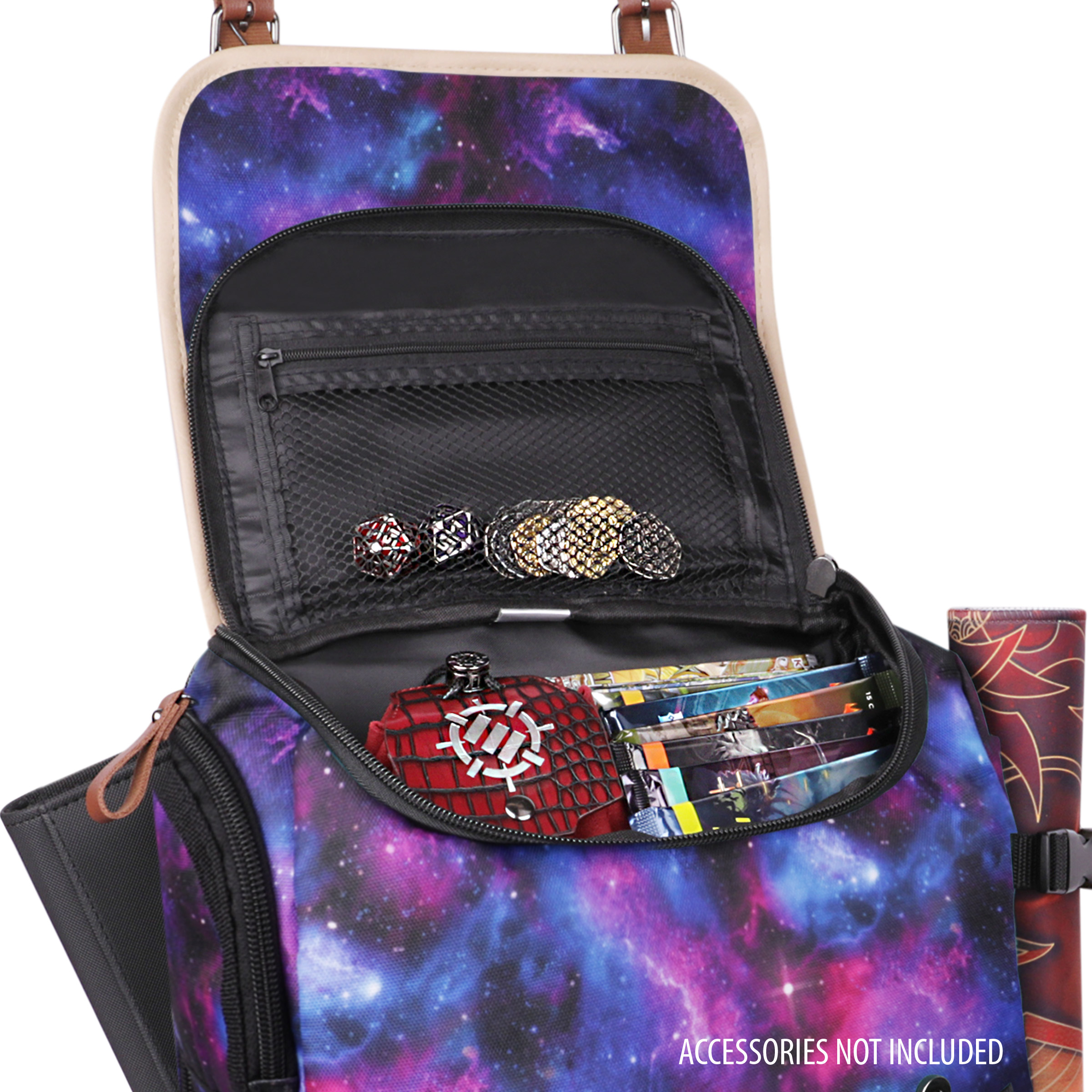 Has a handy top accessory compartment that can hold various trading card accessories, such as dice set, metal tokens, card sleeves, and more. You can fit standard size dice or other small items in the mesh pocket inside the compartment. The compartment also has a zipper closure and a soft lining to protect your accessories from scratches and damage.
