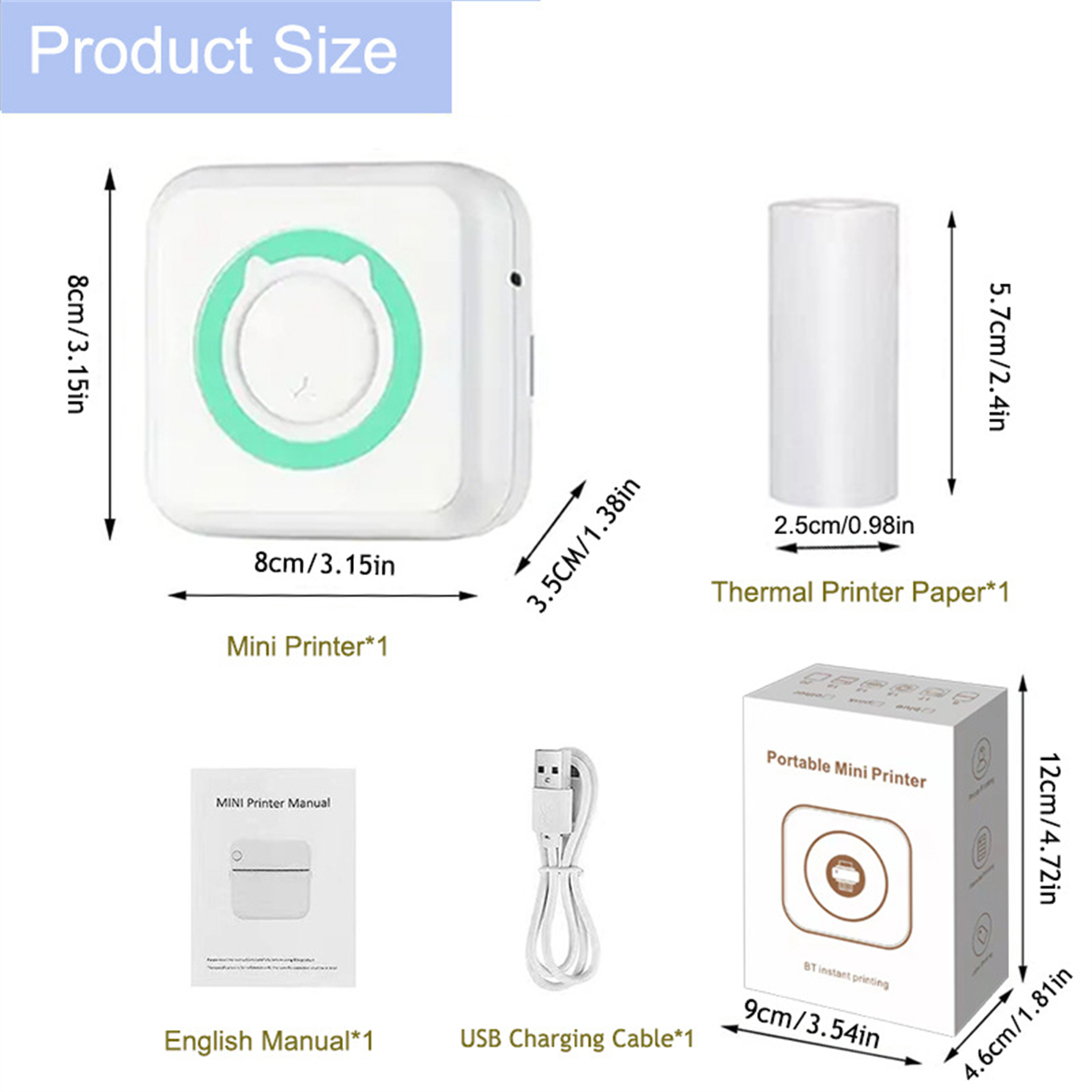 Size:Printer:8*8*3.5cm,Printing paper:5.7*2.5cm