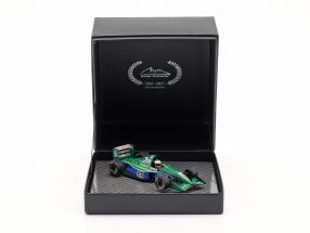 The model was produced in the usual Ixo high-quality and reflects back the original as possible. Model features: Miniature car of Michael Schumacher's Jordan Ford J191, First F1™ Grand Prix Race 1991, 1/43 scale. With this legendary car Michael Schumacher took part in his first Grand Prix race on 25.08.1991 in Spa-Francorchamps - Belgium. After he became a substitute regular driver in Eddie Jordan's team without further ado, he was able to start his first race with the Ford J191. Although he had never driven the track in Spa before, he was able to finish 7th in qualifying. In the actual race, Schumacher was able to fight his way up to 5th place, but then retired due to damage to the clutch. This model car of the Ford J191 with striking 7Up livery has been faithfully reproduced with many, small details by the manufacturer Ixo. The 1/43 scale model is limited to 1991 pieces and comes in an exclusive clamshell box. |