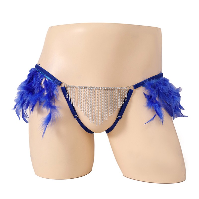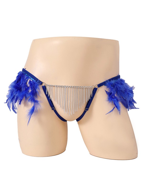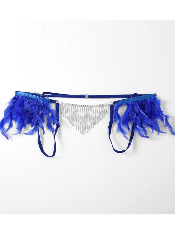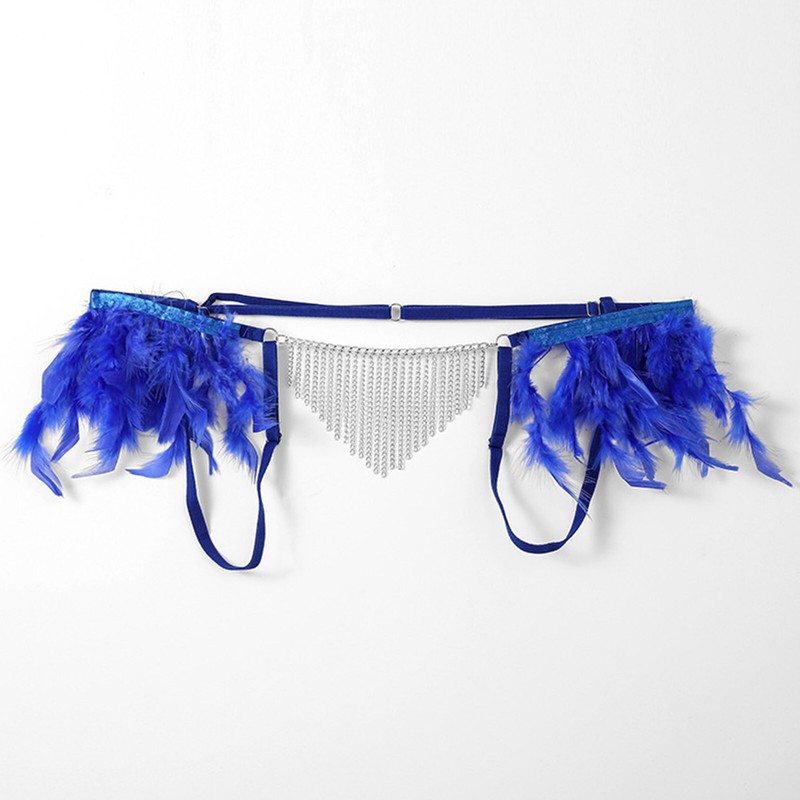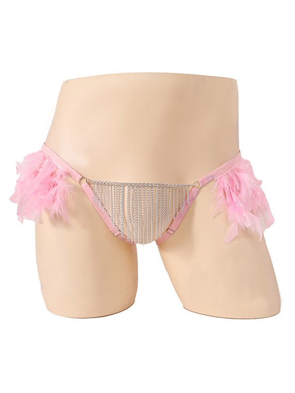 Superbly intriguing design: plush feather on the side of waist, metal chain tassel on the crotch, bring an unexpected dual touch.