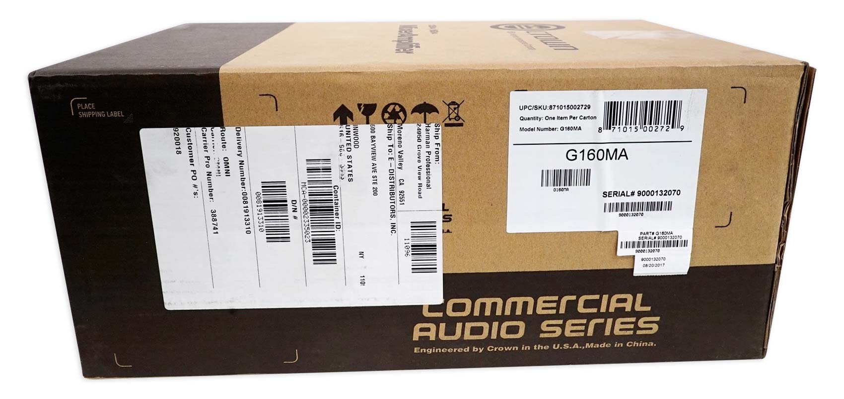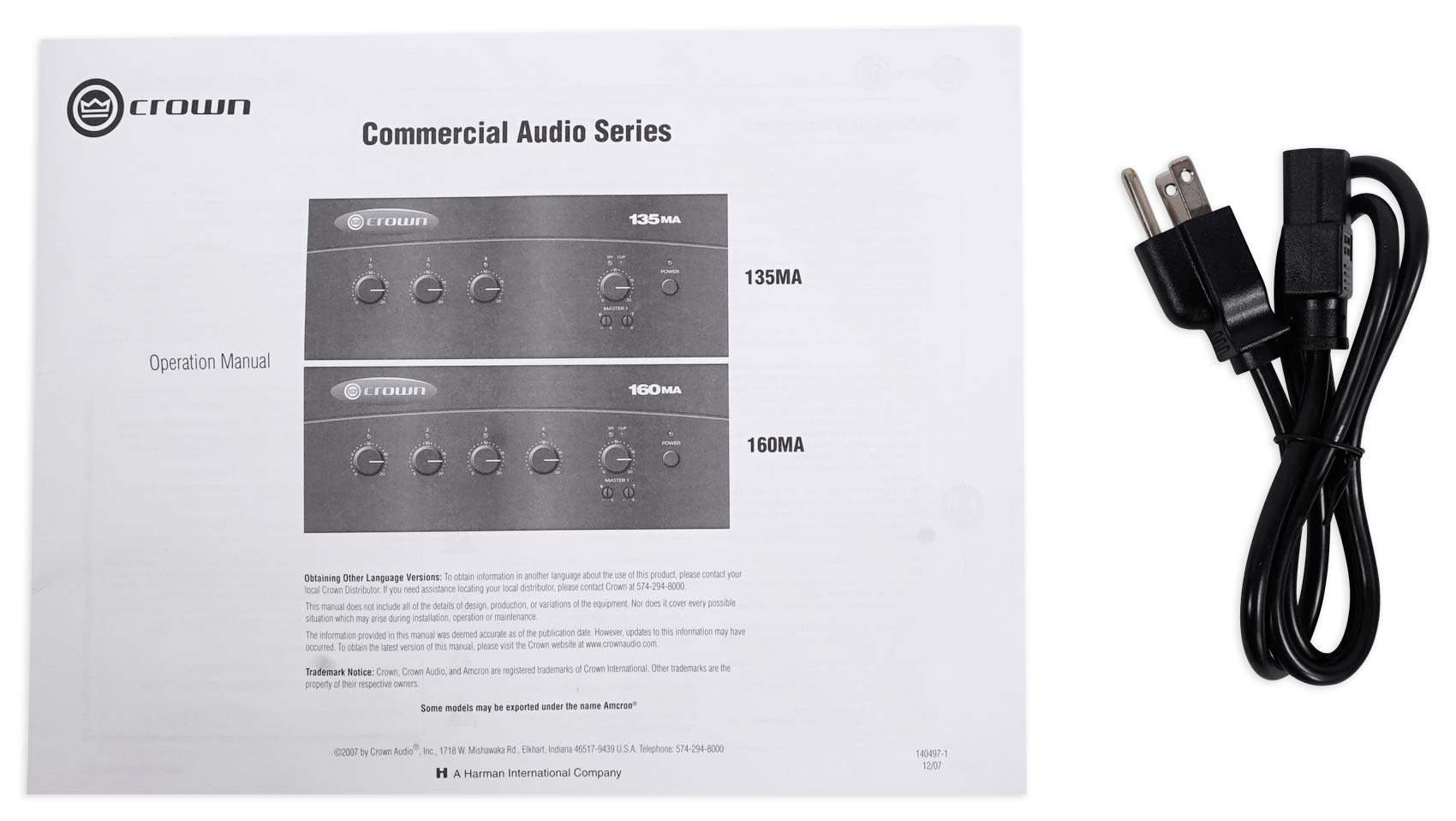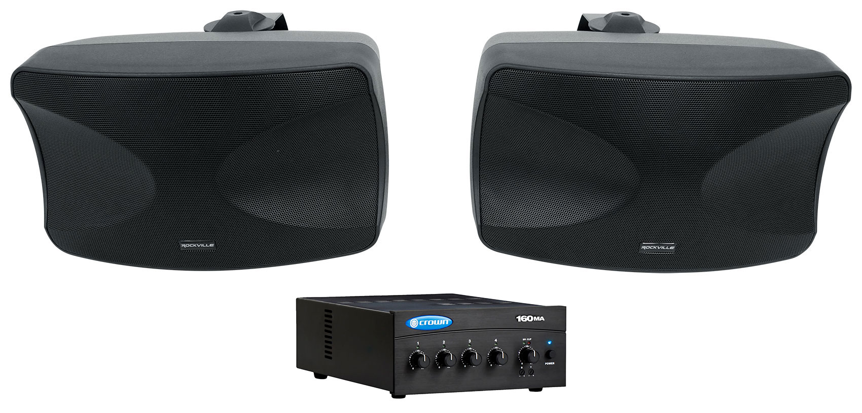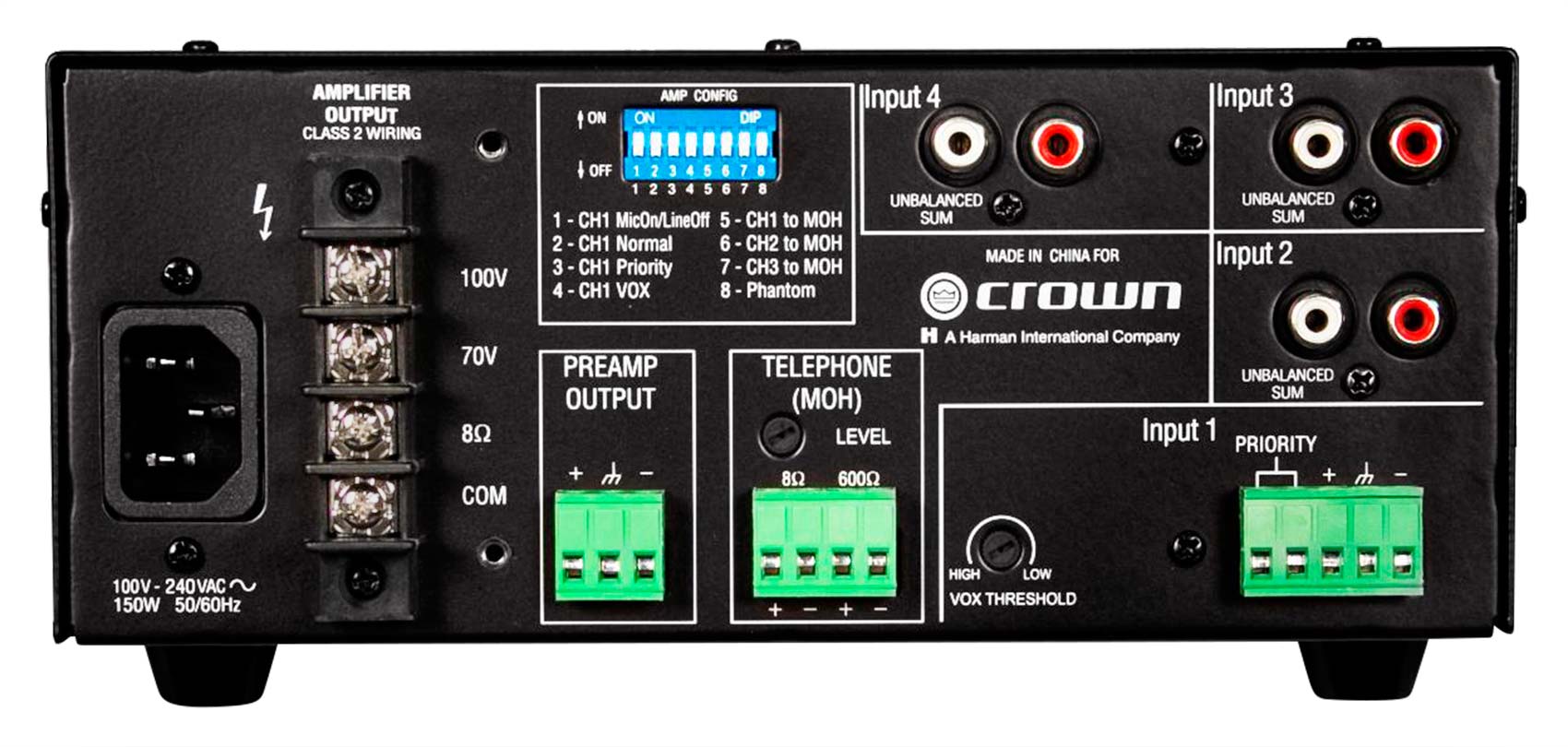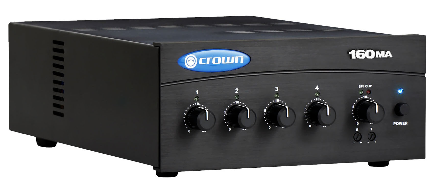 Crown's 160MA is a high value mixer-amplifier for commercial audio. It provides 8-ohm and constant-voltage outputs (100V). Typical uses are paging, background music, and music-on-hold. The 160MA provides 4 inputs (each with a volume control) and a 60W amplifier output. Other features include priority muting, voice activated muting, phantom power, and bass and treble controls.