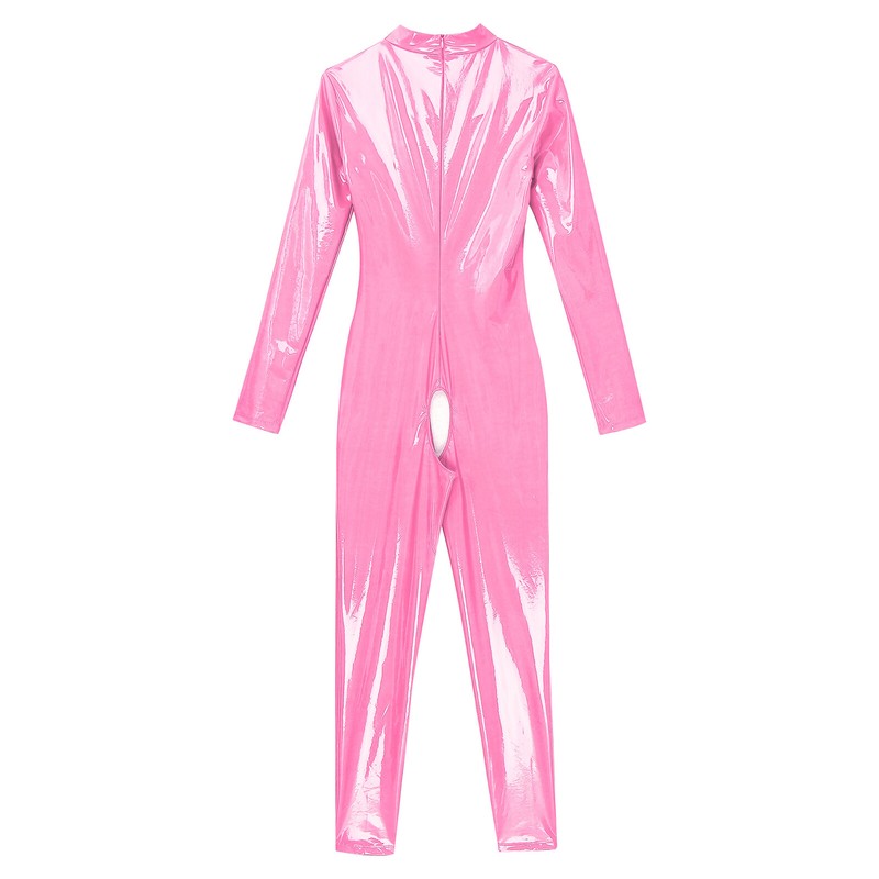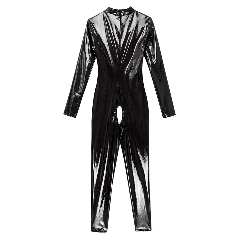 Patent leather bodysuit snugly fits your curvy figure, fully enhancing your charms and attractions. Back metal zipper closure