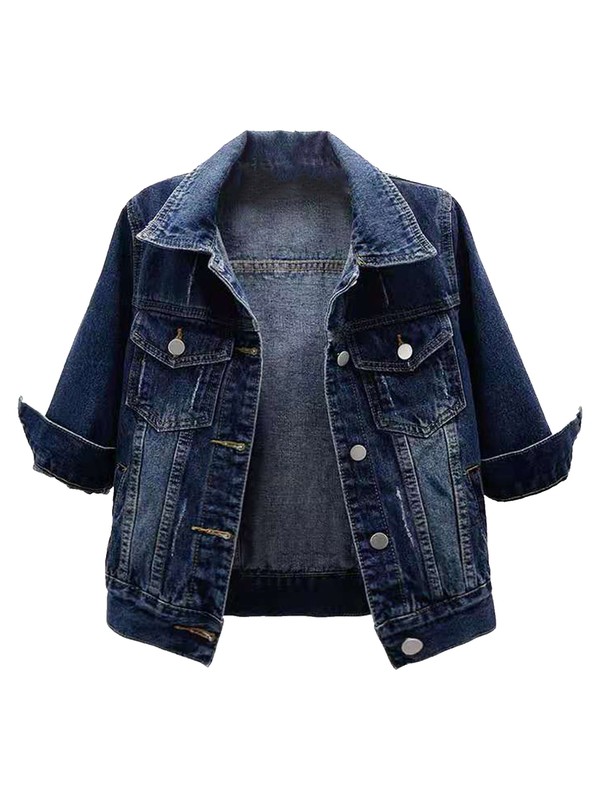 Casual denim jacket features 3/4 sleeve, turn-down collar, button closure, regular fit.