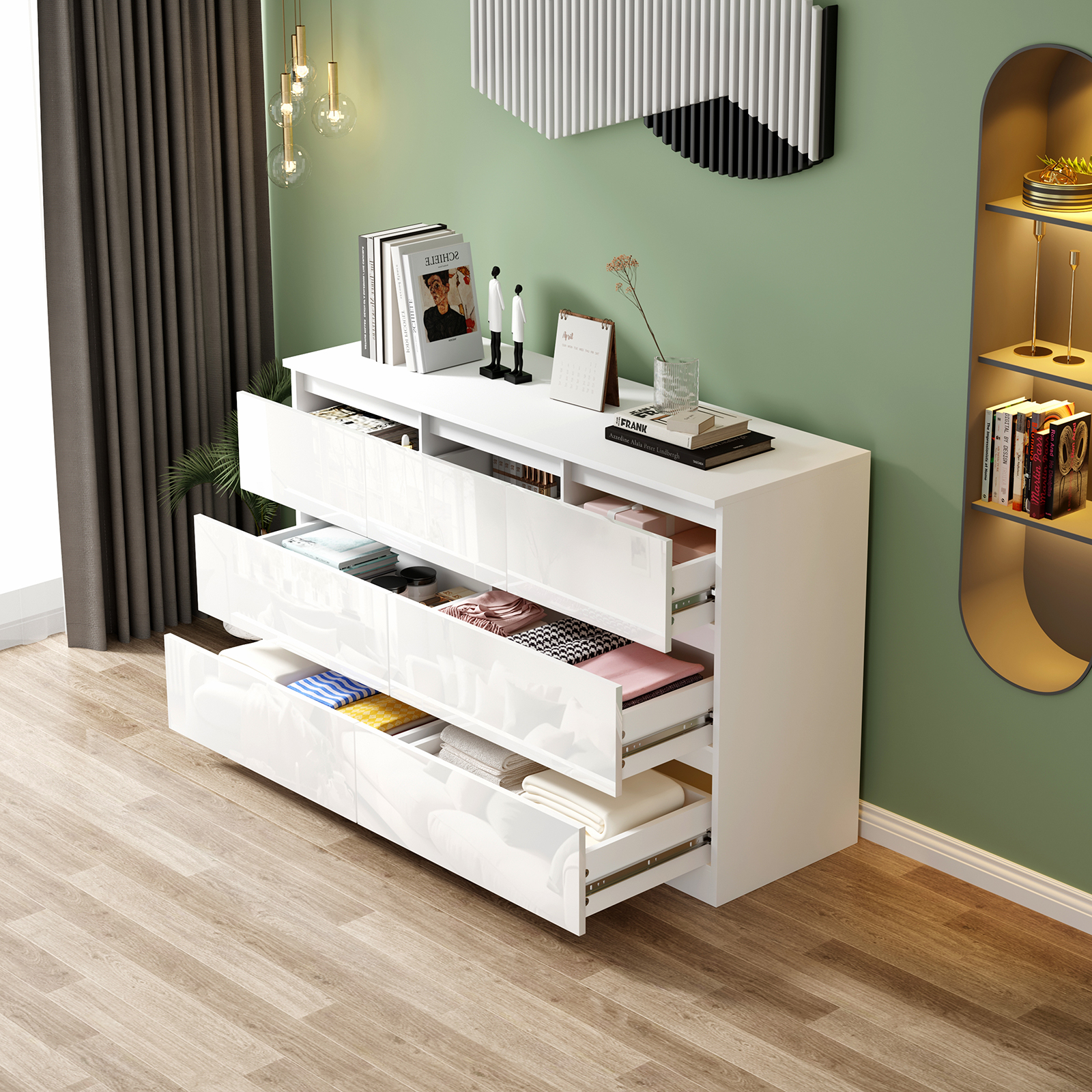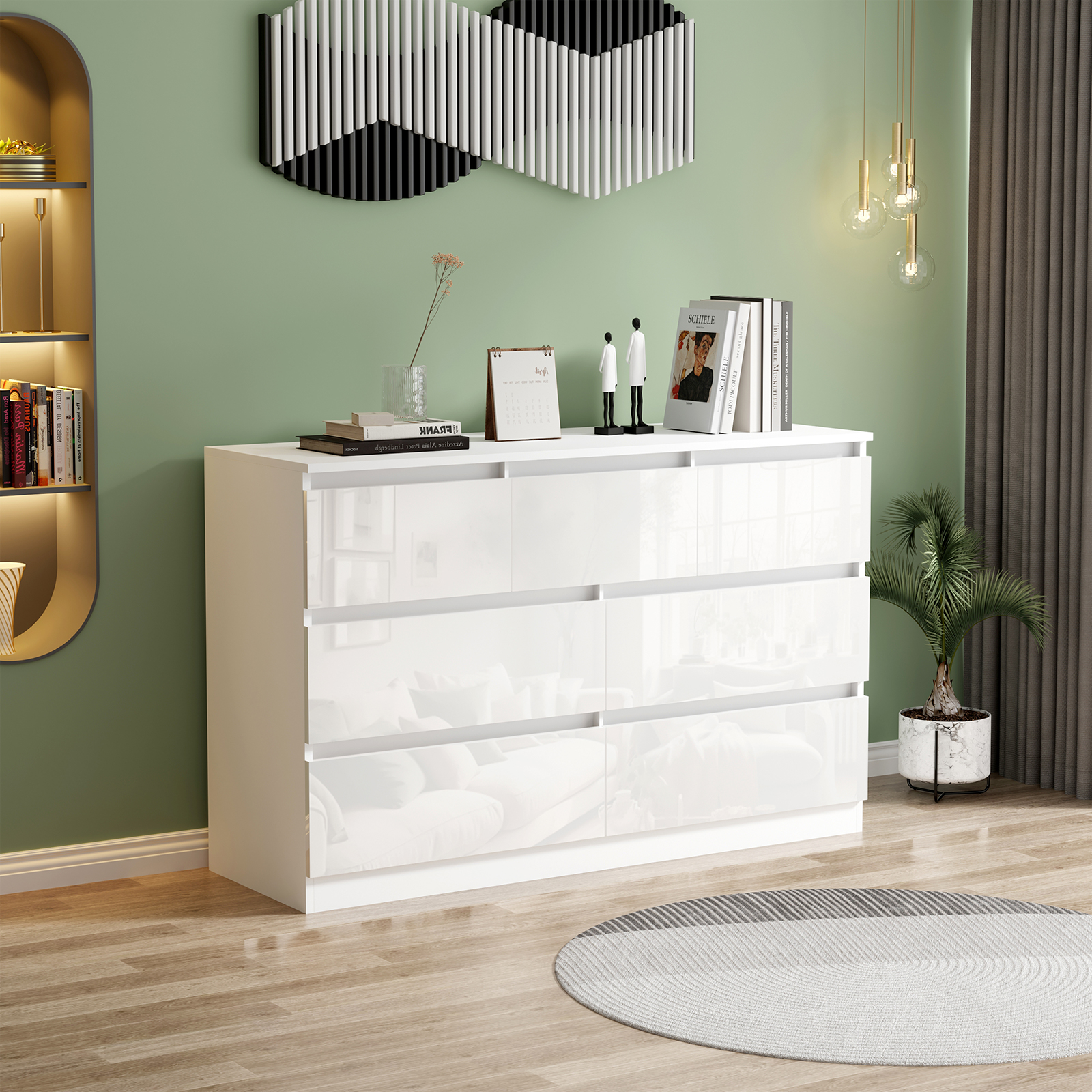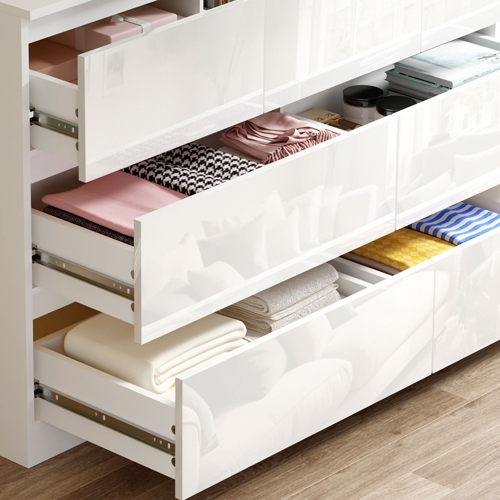High Gloss:The Gloss Drawers, scratch-resistant, ensure the cabinet can match with any style room and office. It is easy to clean with a damp cloth. This is perfect if you have a lot of clothes, or are sharing two chests with a partner, to give you all the space-saving capabilities you need. This drawers chest is ideal for folded clothing and smaller items or can be used as a dresser to do hair and makeup.