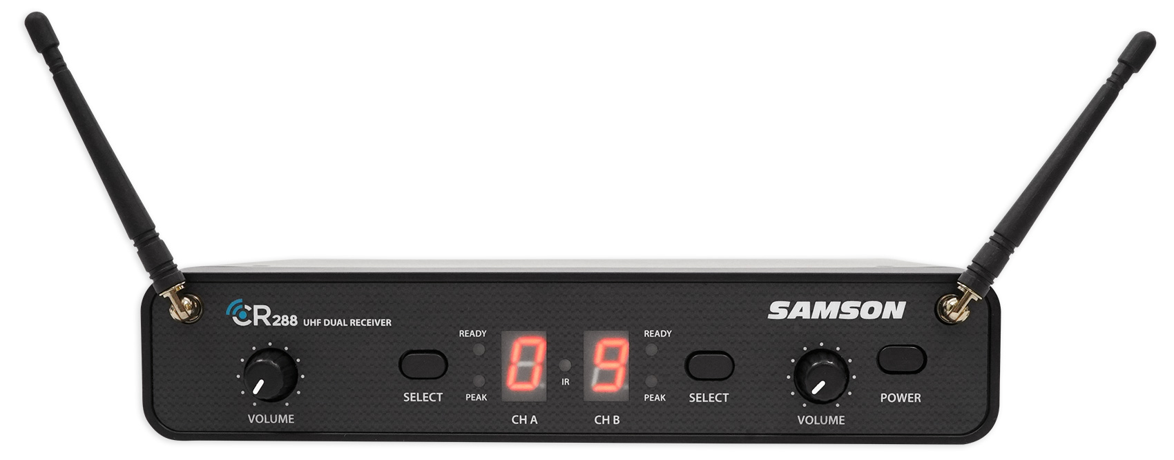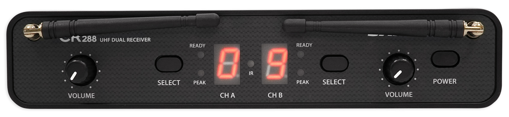 Featuring a user-friendly front panel, the CR288 Wireless Receiver provides the system with fast and easy setup. To find your optimal channel, the CR288 provides two Select buttons for auto syncing the receiver and transmitter channels via an infrared signal. The panel also contains a dual 7-segment LED for the operating channels, two Volume knobs, two tuned antennas, as well as Ready and Peak indicators for optimal functionality and monitoring. The back of the receiver features two separate balanced XLR outputs for routing signals to two separate mixer channels, as well as a 1/4" unbalanced mix output that condense both signals to a single channel for a direct connection into a PA speaker.