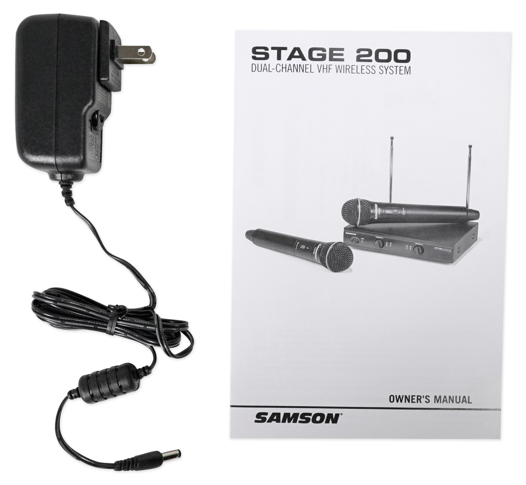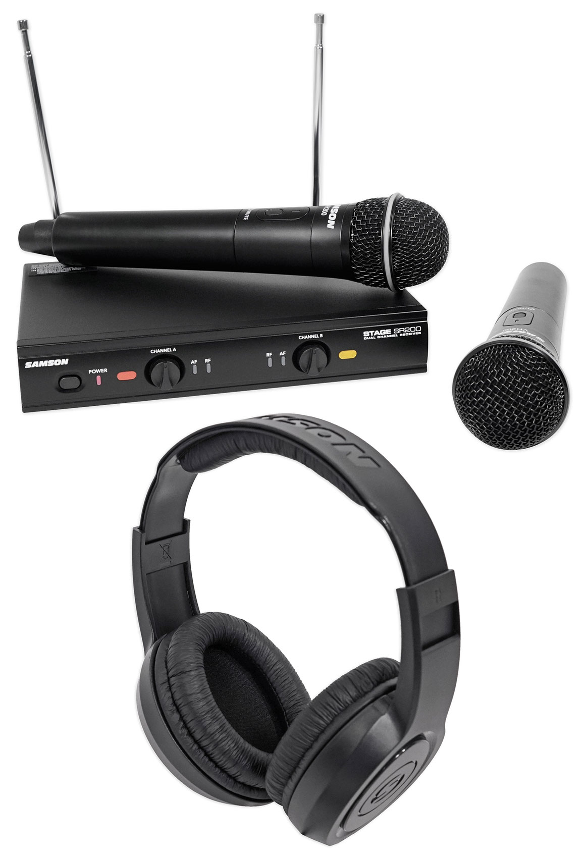 Samson's Stage 200 is a dual-channel wireless microphone system that provides two handheld dynamic microphones that transmit to a single rugged metal receiver. Each handheld features Samson's Q6 mic element, providing crisp, clear sound and reliable VHF wireless performance for home karaoke, live presentation, education, house of worship and other dual-performer applications.