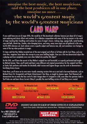 On this DVD, you'll learn the secrets to Roy Walton's original two-card brainchild, as expertly performed and taught by Michael Ammar. Then, you'll watch and learn some different and original presentations for the original Card Warp as Scotty York performs and teaches his decidedly adult version and Eugene Burger uses the cards to demonstrate a horrifying history lesson. From there, you'll move on to even more visually amazing versions that use a card and a borrowed banknote, such as Michael Close's Dr. Strangetrick and Howie Schwartzman's Star Warp, as taught by Ammar again. Paul Diamond will demonstrate how to make the face of a deck change when it's wrapped in a bill, even when the spectator holds it. You'll also see and learn Bruce Cervon's Warp II, possibly the most baffling version of Card Warp ever created.