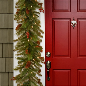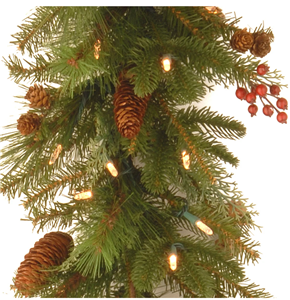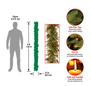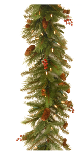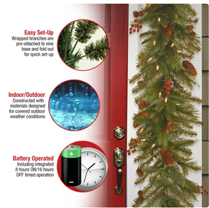 The Noelle is an attractive mixed tip garland featuring branch sprigs and pine cones. It is pre-strung with 50 battery-operated warm white LED lights that are energy-efficient and long lasting. 6 hours ON/18 hours OFF timed operation. This indoor/outdoor garland can be displayed over doors, windows, fireplace mantels, fence, or stairway railings.
