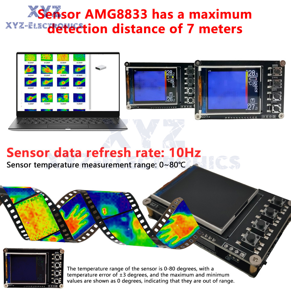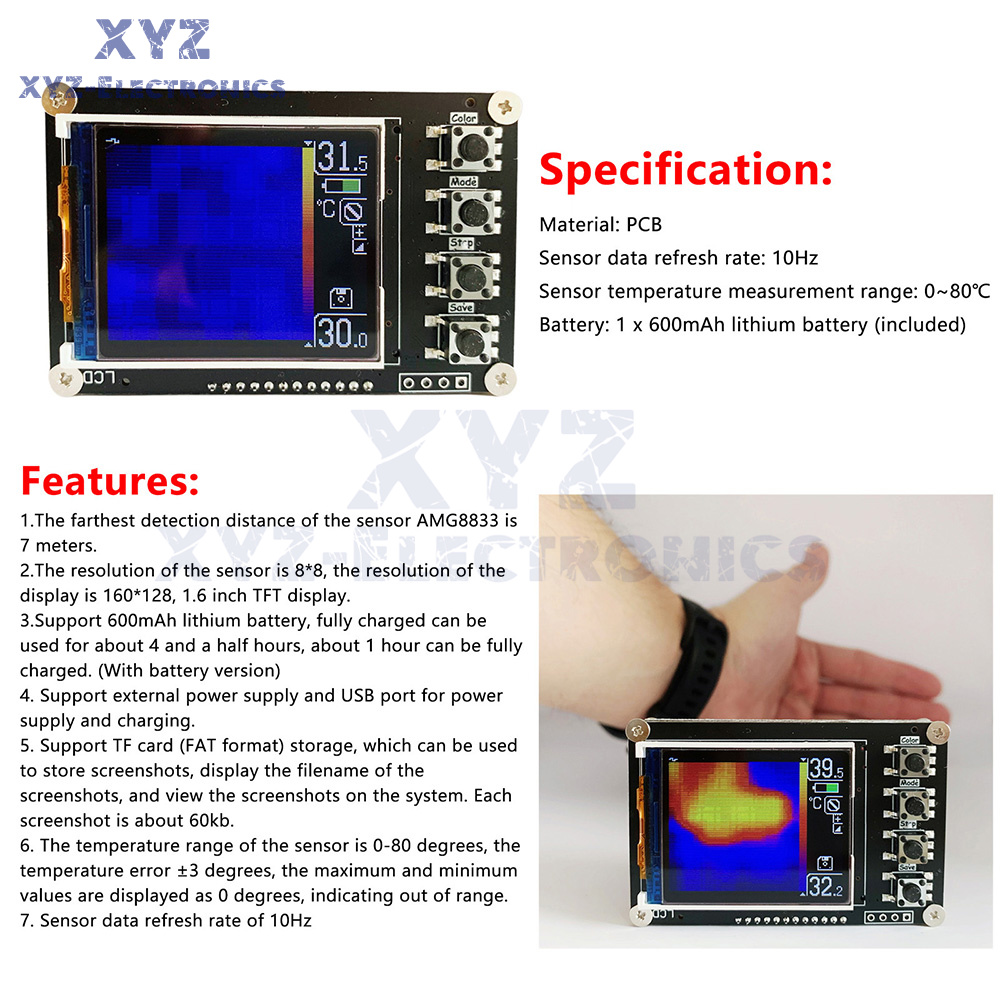 2.The resolution of the sensor is 8*8, the resolution of the display is 160*128, 1.6 inch TFT display.