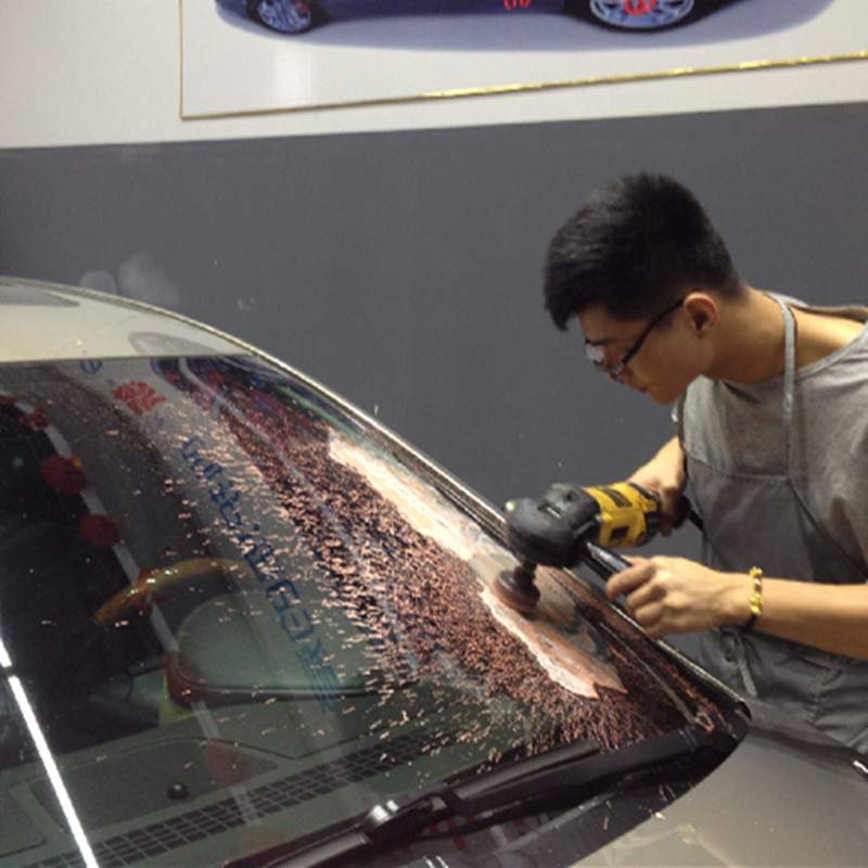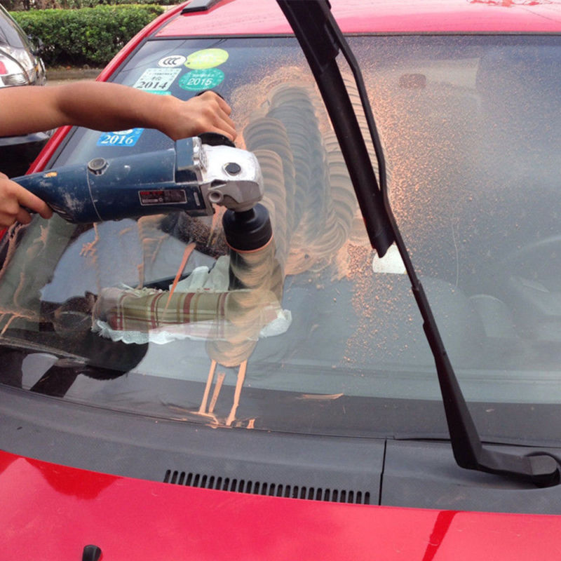 6.Place the polishing wheel on your work area, use small size felt wheel if scrach is near corner of windows ; keep the wheel moving in an up and down and circular motion. Be sure that the slurry does not dry up, as this could cause your glass to overheat and crack. If your slurry is becoming dry, you can spritz it with a spray bottle full of water.