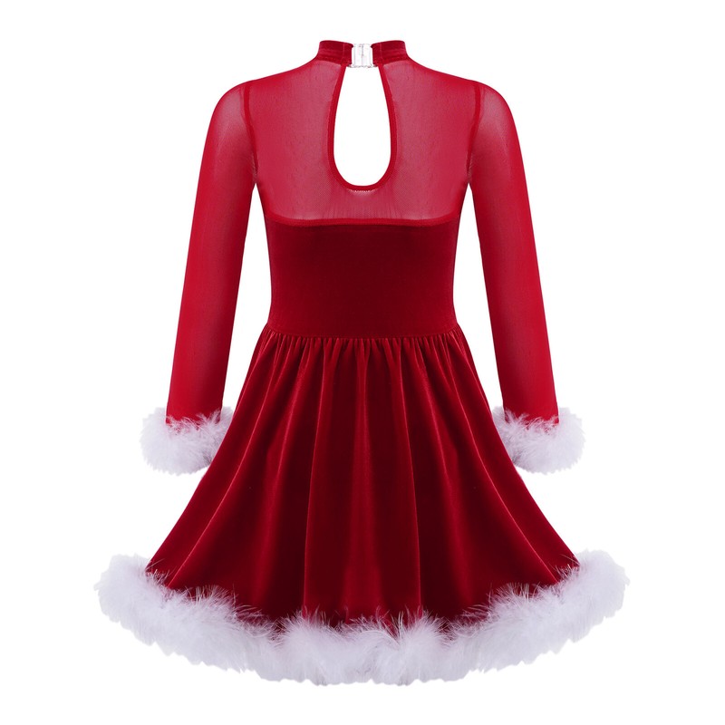 Keyhole back with plastic buckle. Velvet skirt has fluffy feather trim and safety briefs for protecting privacy.