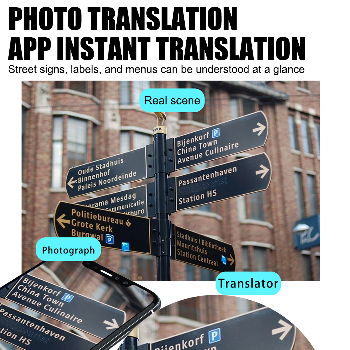 Support for photo translation, and the app can translate photos as soon as they are taken; Road signs, labels, and menus are easy to understand with just one click.
