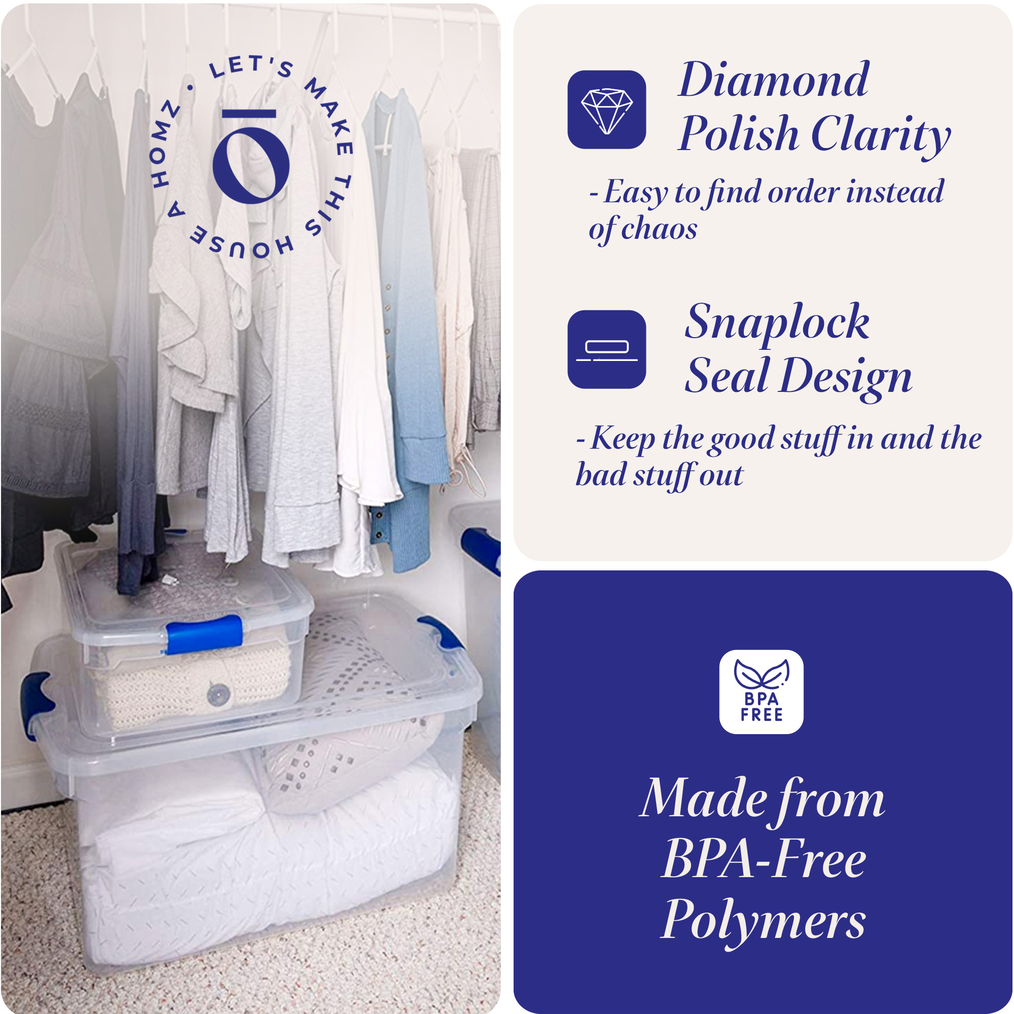 HOMZ believes that no clutter should be left behind. Our wide collection of storage containers is durable, efficient, space-saving, and some would even say sexy. Pick up a few containers to tame your worst mess and bring order to the chaos.