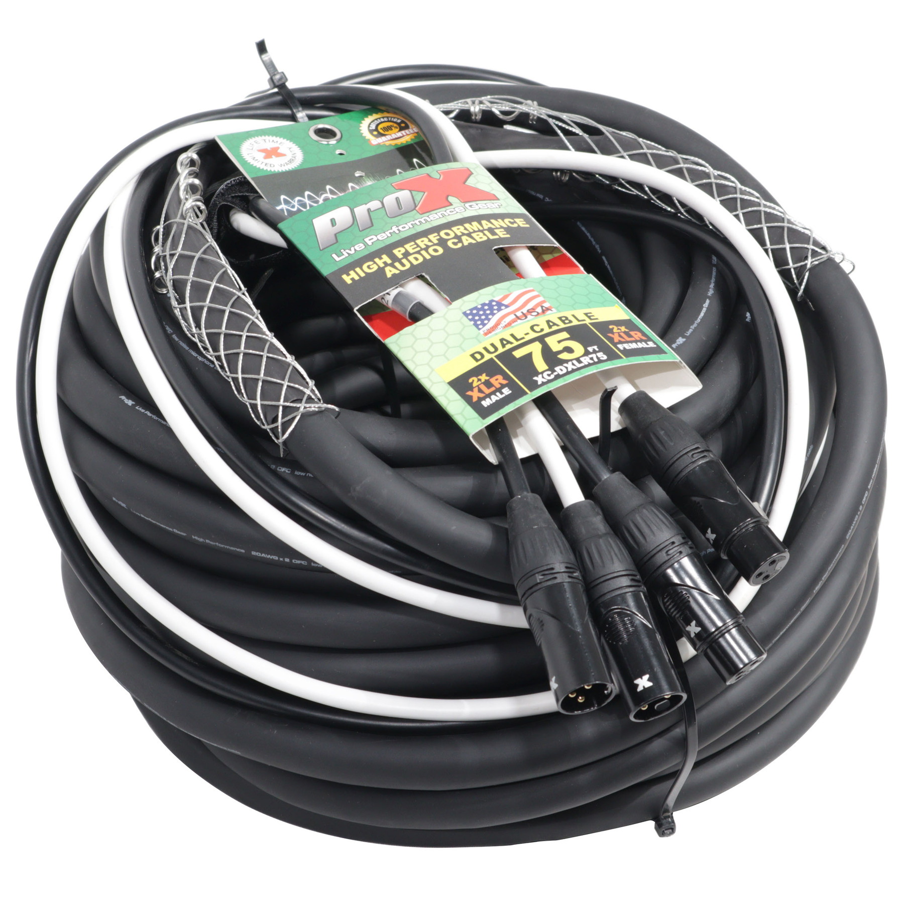 ProX XC-DXLR75 ProX 75' Ft High-Performance Dual XLR-M to Dual XLR-F Audio Cable. ProX Live Performance Gear Cables are made to last you an entire lifetime. Each cable is made with high-quality materials and delivers a clear signal and connection each time. These cables are made by professionals for professionals like you. Each cable is built for High Performance and to withstand heavy everyday use.