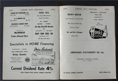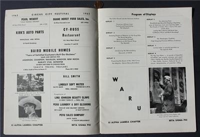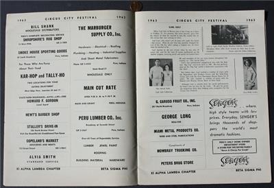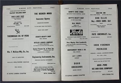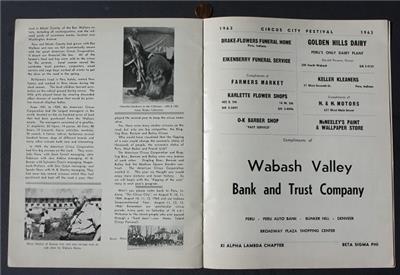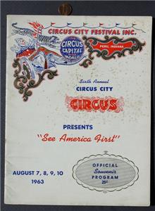 Check it out...Here's a unique ORIGINAL 8 1/2" wide by 11" long multi-paged program from the August 7-8-9-10, 1963 season at the Circus Capitol of the World in Peru, Indiana. Front cover of the program features images of a clown and elephant and reads: "Circus City Festival Inc. Peru, Indiana The Circus Capitol of the World. Sixth Annual Circus City Circus Presents See America First August 7,8,9,10, 1963 Official Souvenir Program"- Program details the planned show and is full of GREAT real photos of the performers, lengthy text about the production, history, local ads and info with photos of past stars like Jack Dempsey, Cowboy stars Tom Mix & Ken Maynard inside too! Program has some wear and soiling consistent with age and normal use, but still, how many of these survived at all? A great VINTAGE item ready for display. This is an ORIGINAL item, NOT A REPRODUCTION item! Postage information is listed at the bottom-$ 7.95 postage is required.