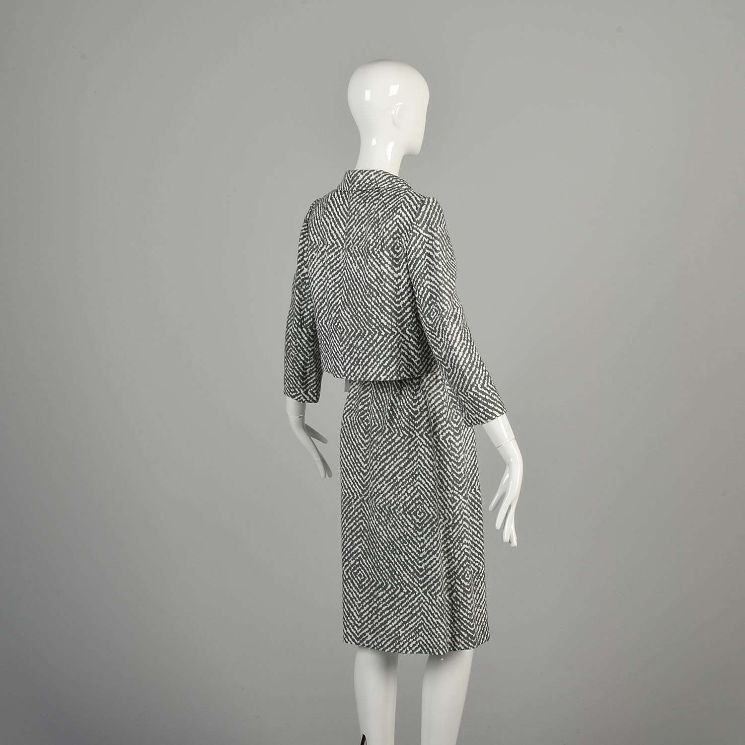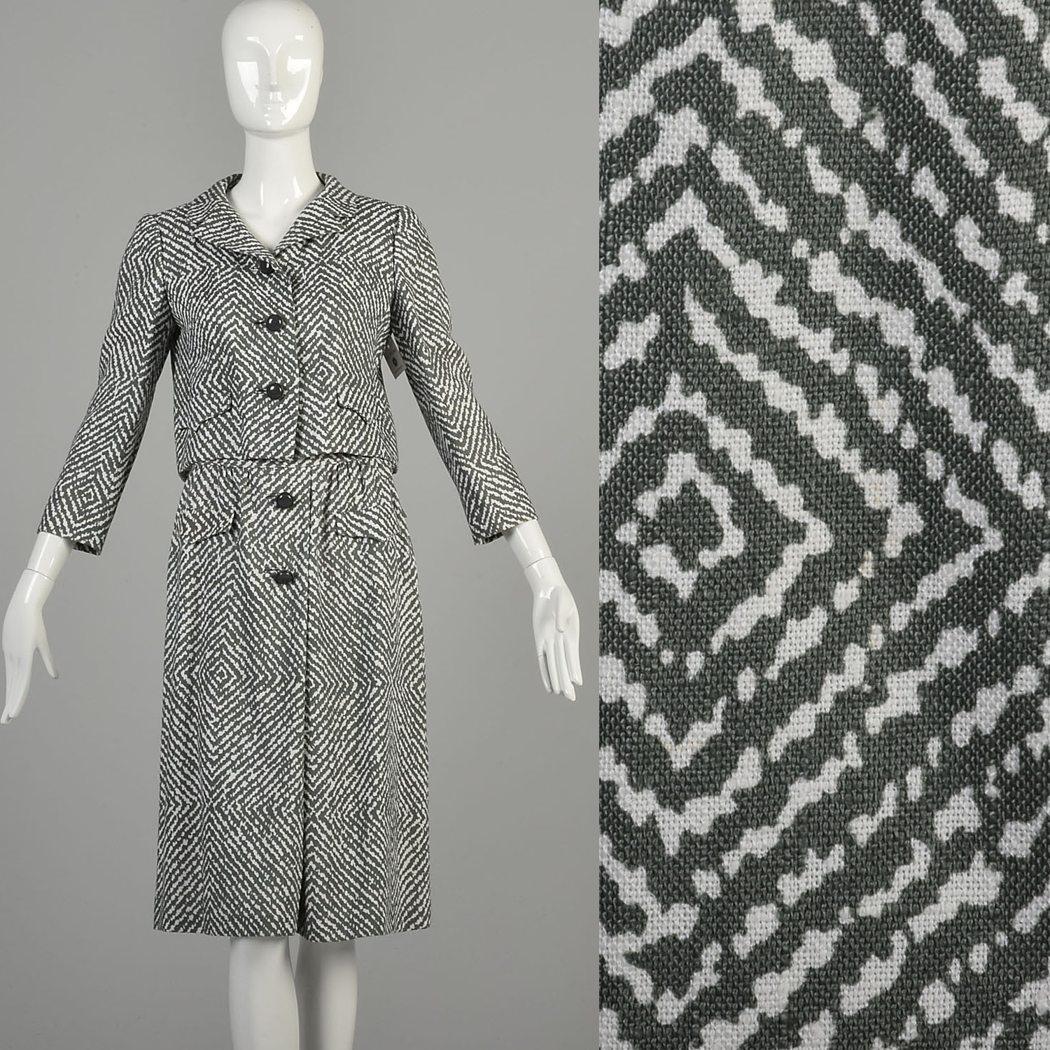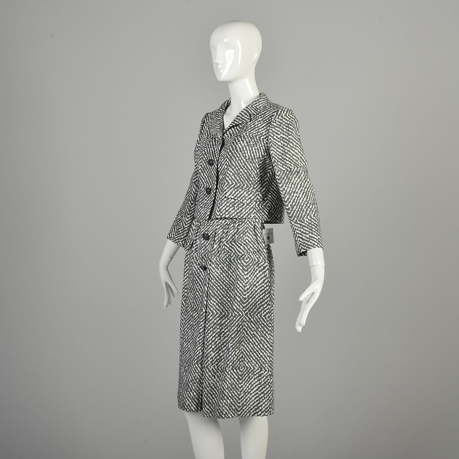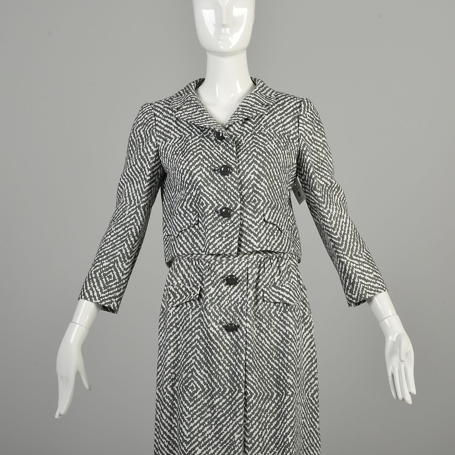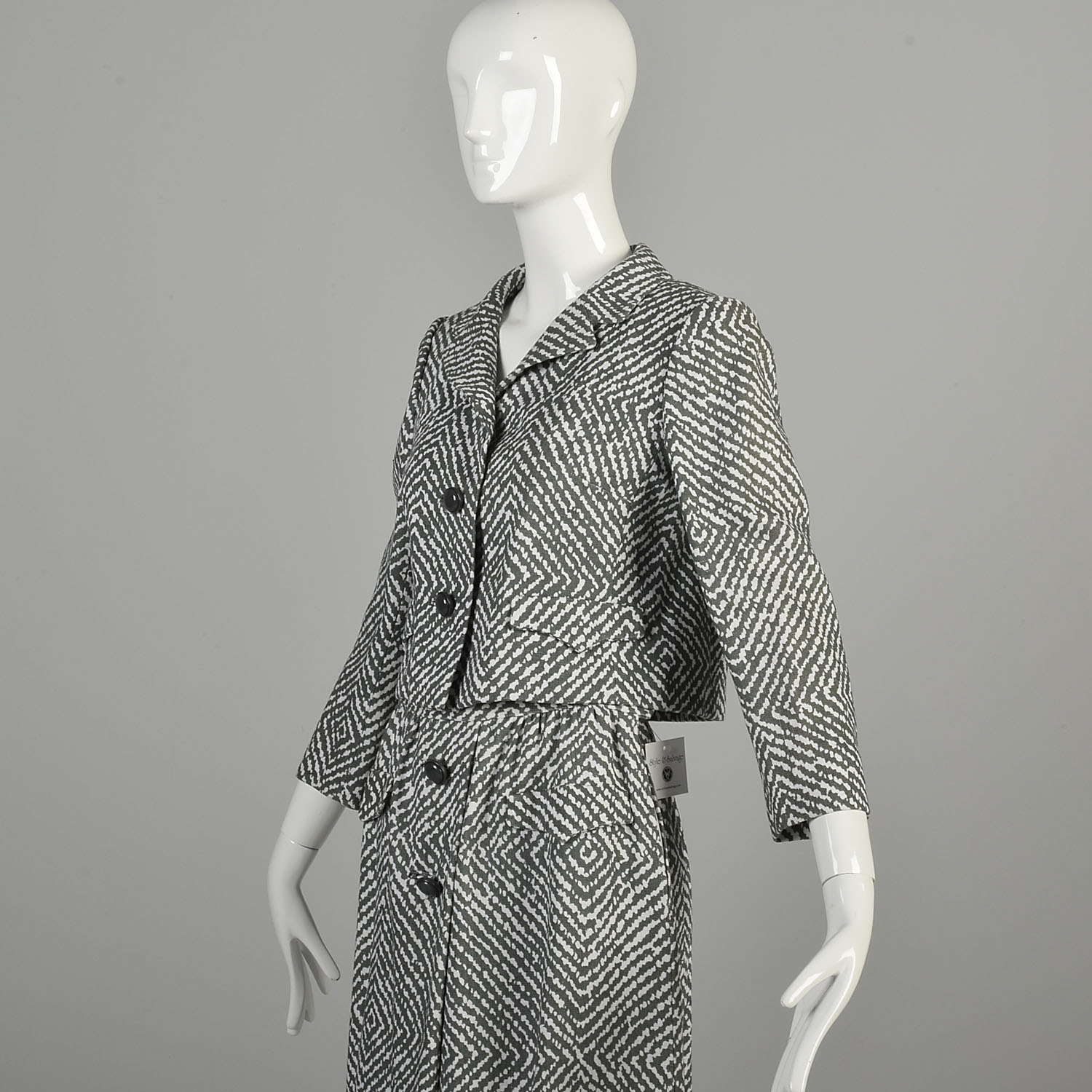 Small 1970s Skirt Suit Set Cropped Jacket Grey White Geometric Hannah Troy