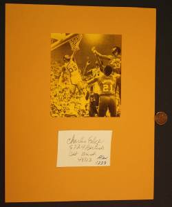 Check it out...Here's an UNCOMMON 8 1/2" wide by 11" tall AUTOGRAPH & photo of ABA Indiana Pacers star Charlie "The Razor" Edge- The large signature is clipped from an envelope with Charlie's address written in his own hand and is tipped to a larger gold backer with a great ABA photo of Edge in action with that ole RWB ball against the Sounds on front.