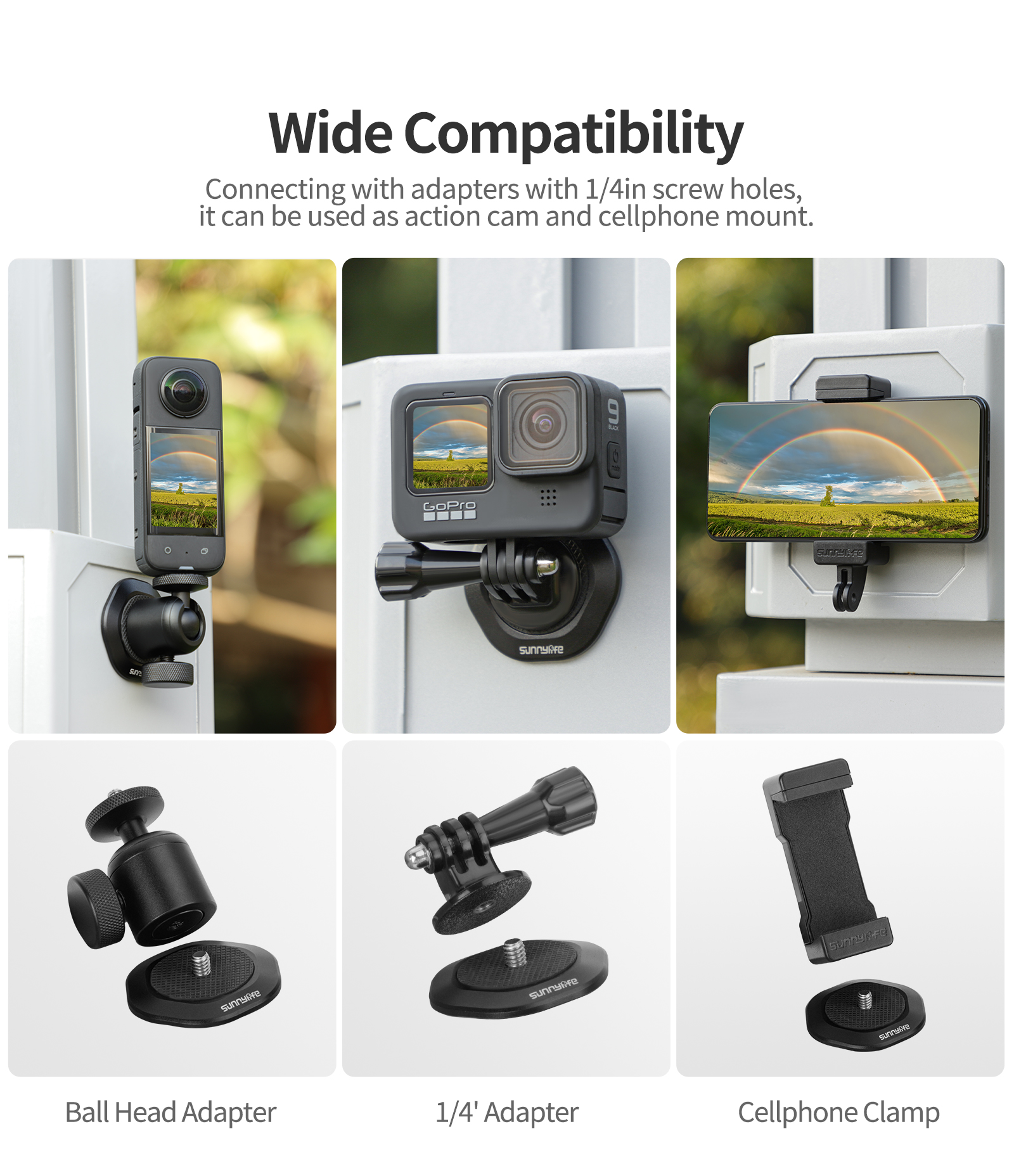 Widely expand. Paired with a 1/4 "screw adapter accessory, it can be used to mount sports cameras, mobile phones, and other devices