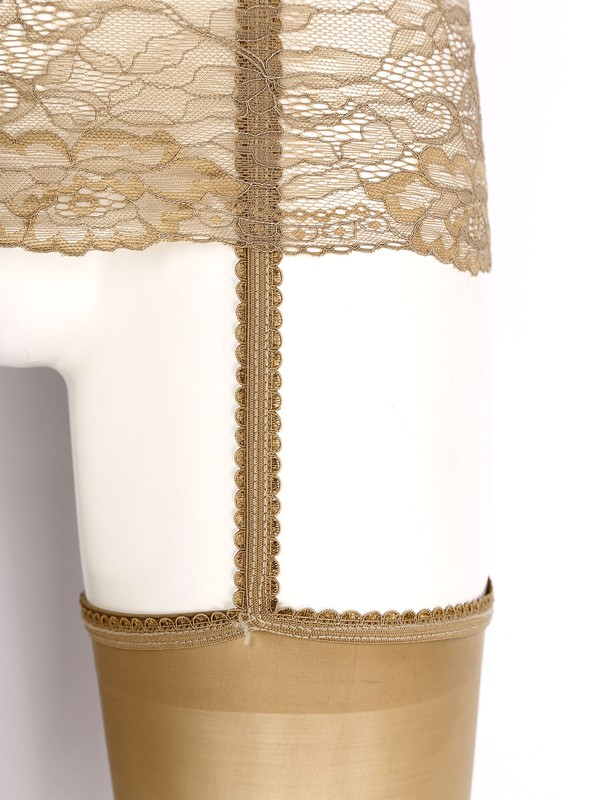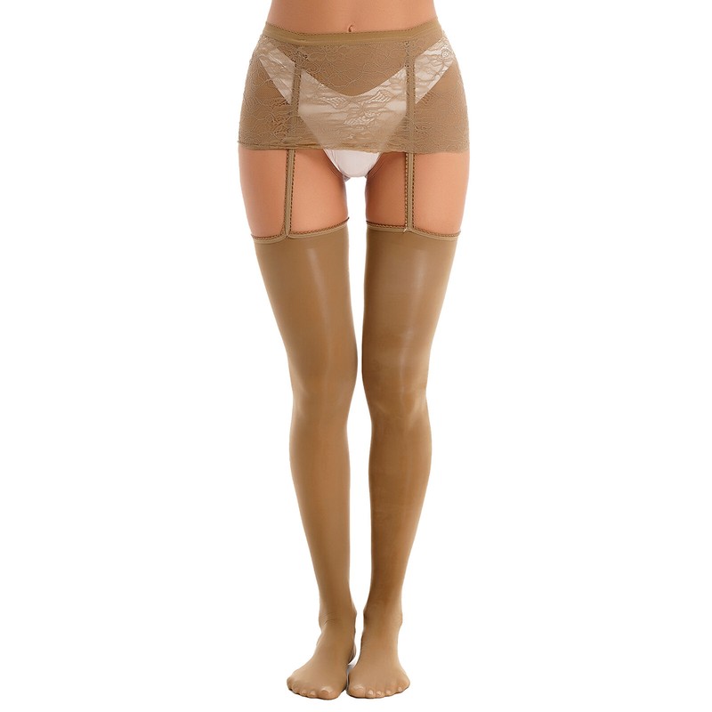 Garter belt with thigh high stockings have semi-sheer and glossy look. High elastic fabric helps enhance your curvy figure.