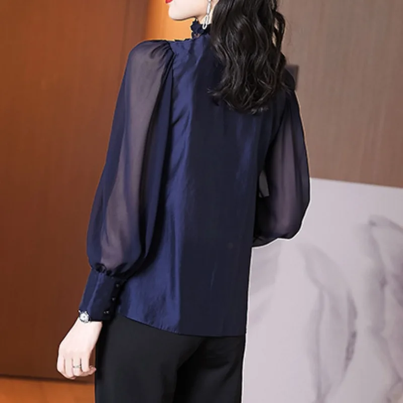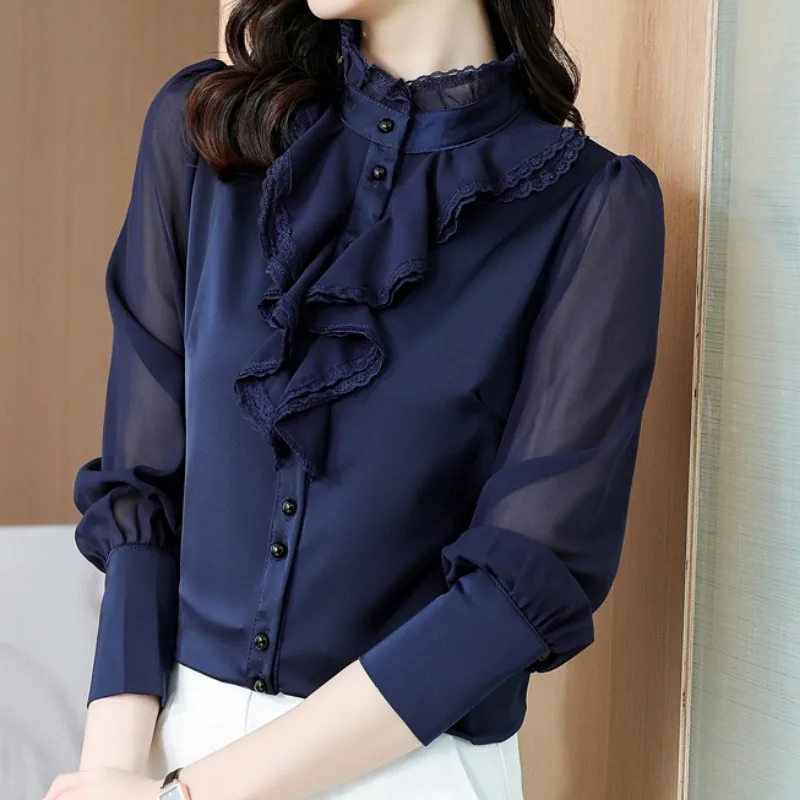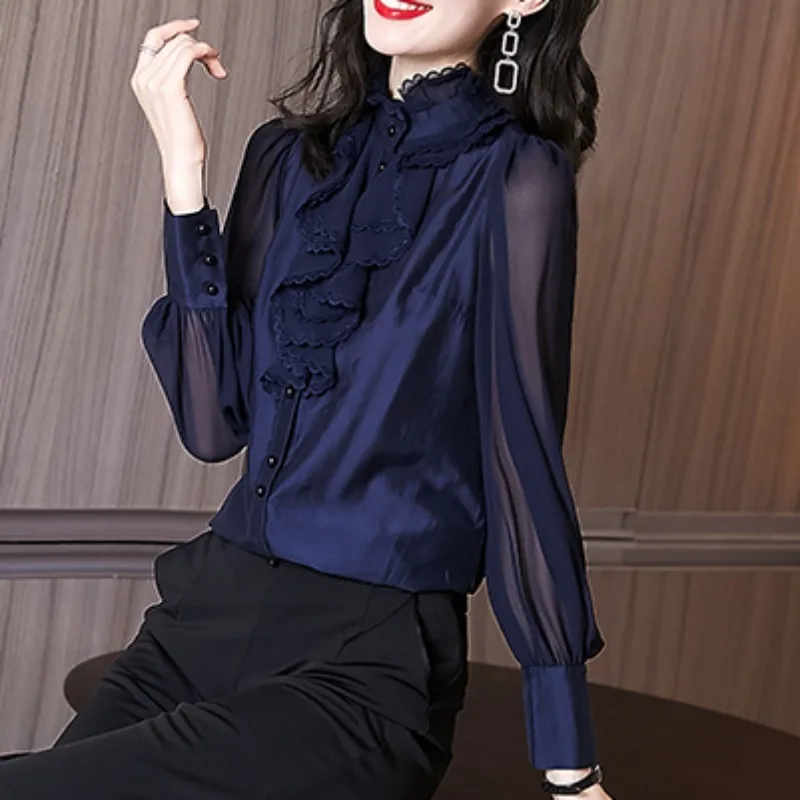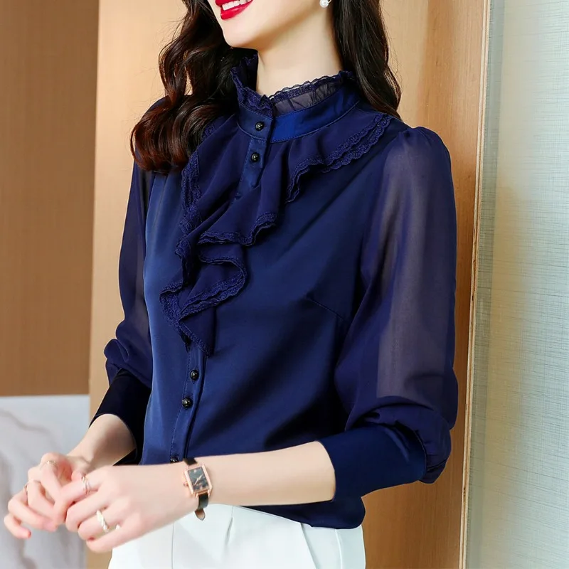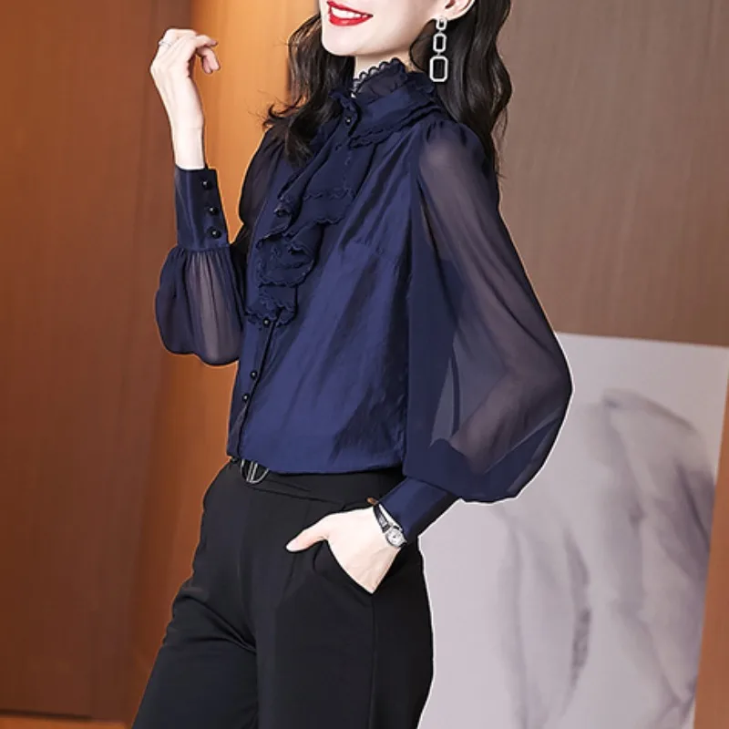 M-XXL Long Sleeved Chiffon Button Blouse With Ruffles Casual Office Fashion NEW
