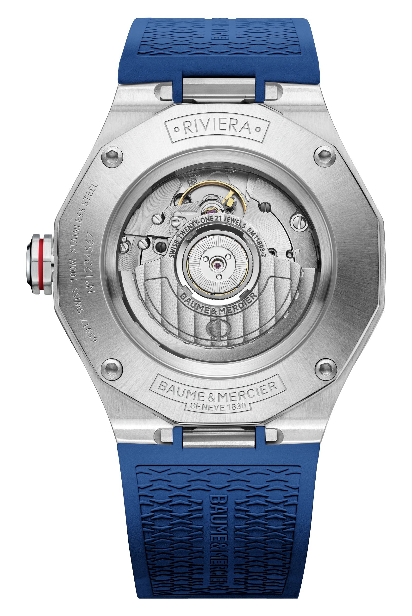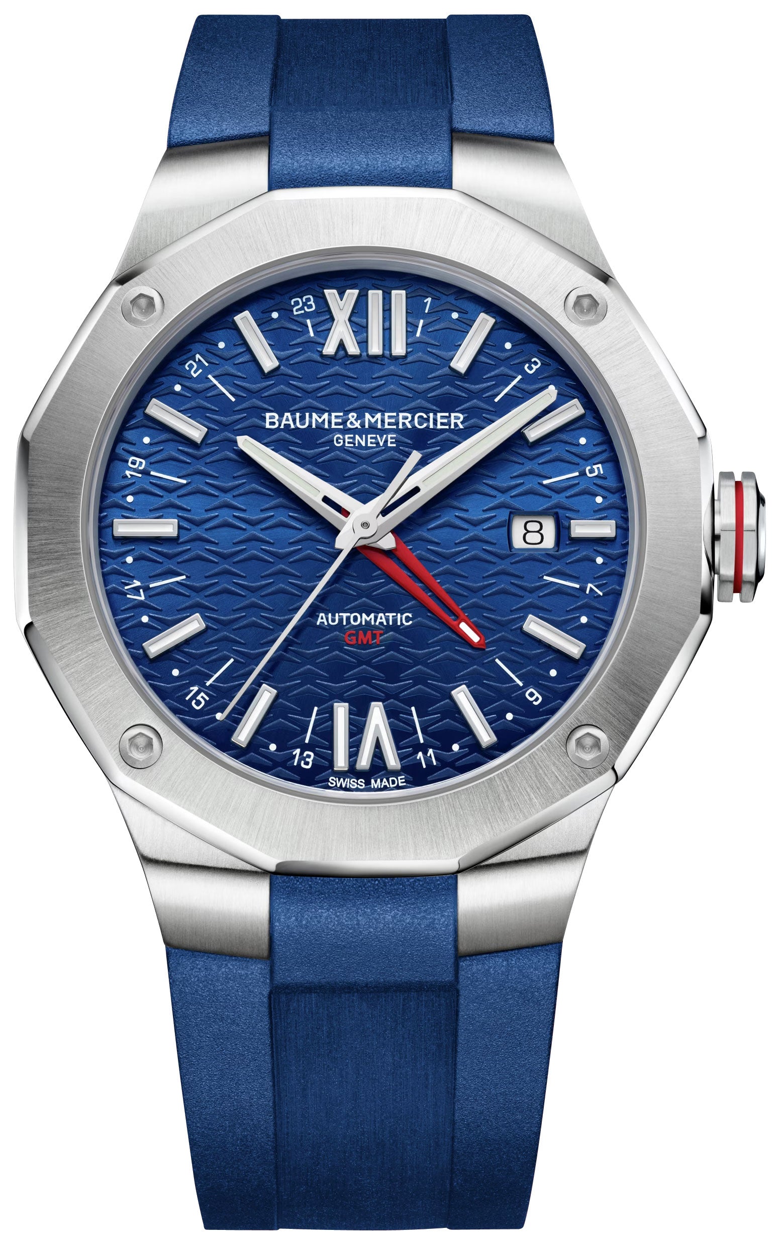 Created in 1973, the Riviera's return last 2021 aims to revive the spirit of a distinguished watchmaking era. This sporty and highly functional GMT version features a 42 mm brushed and polished dodecagonal stainless steel case equipped with a fixed bezel, fastened with 4 screws and an octagonal signed crown at the 3 o'clock. Safely within is a sunray blue dial layered with a unique wave pattern motif symbolizing the convergence of the mountains and the ocean and adorned with silver-tone, luminescent applied indices and Roman numerals at the 6 and 12 o'clock as hour markers and obelisk-style hands. White Arabic numerals and dots are evenly spread in between the indices which serve as a peripheral 24-hour scale. Complementing it further is a scratch-resistant sapphire crystal and a date aperture at the 3 o'clock for added function. Touches of white and red contrast is evident via the dial texts and markers, date background, lume fillings, GMT hand and crown. Fitted with a blue rubber strap secured by an adjustable triple folding clasp with security push-pieces complete the sporty and durable look. This watch has a screw-on exhibition caseback showcasing the caliber BM 11893-2, a Swiss automatic GMT movement beating at 28,800 vibrations per hour and is water-resistant up to 100 meters/330 feet.