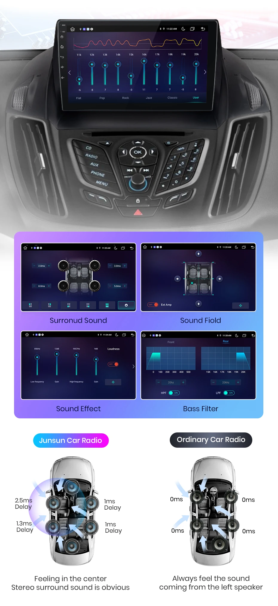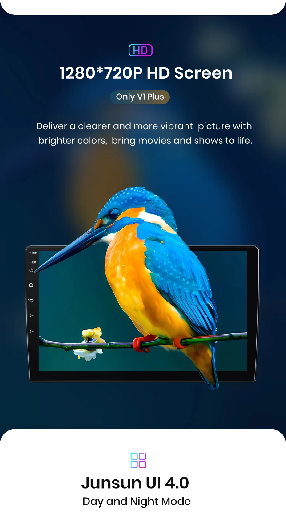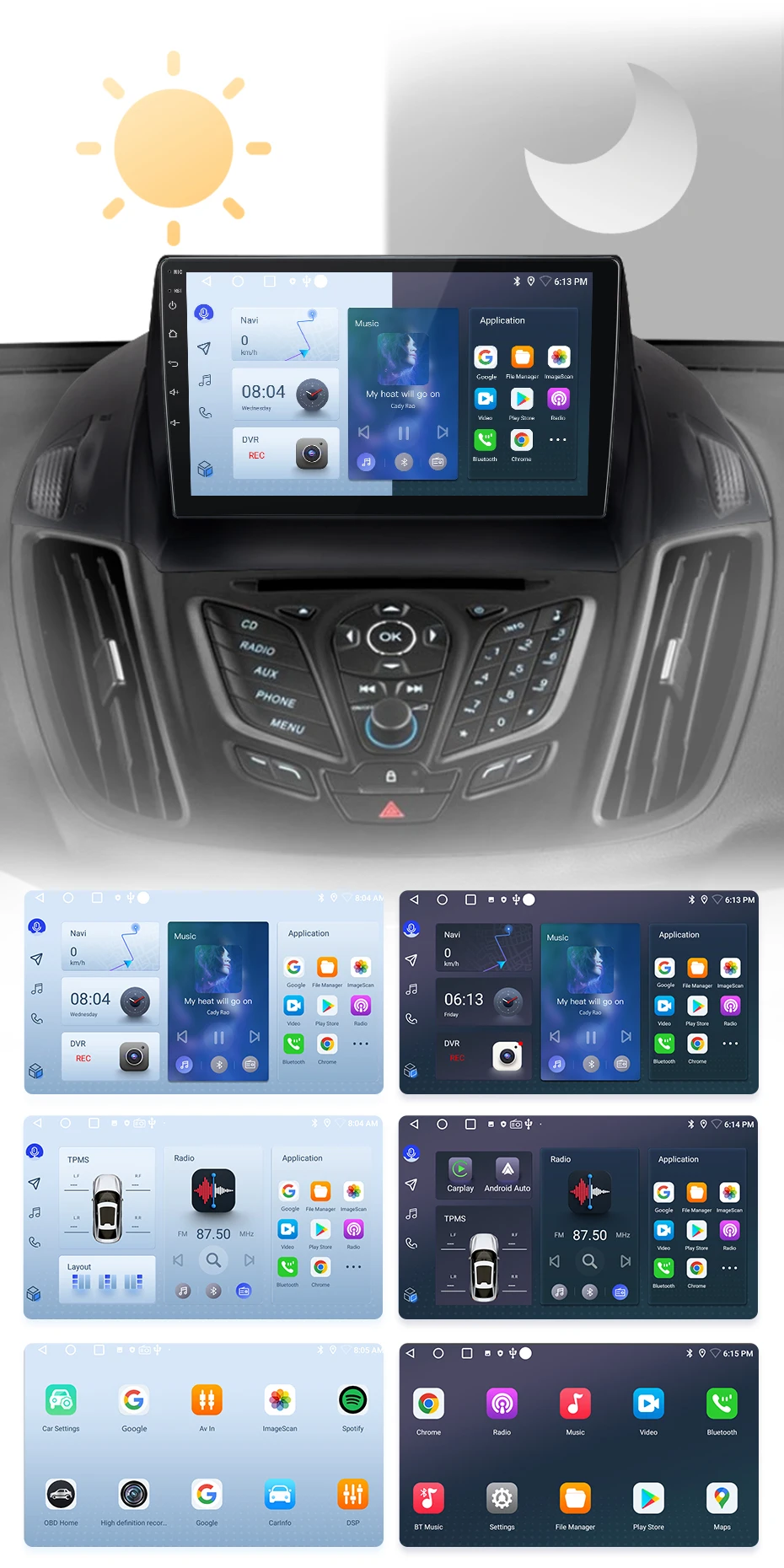 La radio passa tra le modalità diurne e notturne utilizzando i fari dell'auto per regolare la luminosità generale dello schermo per adattarsi all'ambiente circostante. Le funzioni comuni sono integrate nel desktop, ti consente di passare da navigazione, musica, chiamate Bluetoo-th e altre caratteristiche comuni con un solo clic. Il design dell'interfaccia utente personalizzato di Junsun migliora la praticità e la sicurezza durante il tuo viaggio;