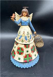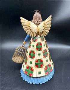 Jim Shore brings his timeless artistry to this beautiful angel, circa 2002. She wears a quilt pattern dress, has cream colored wings, a metal halo, and holds a metal bird cage in one hand a a bird in the other. She stands approximately 6.75” H.