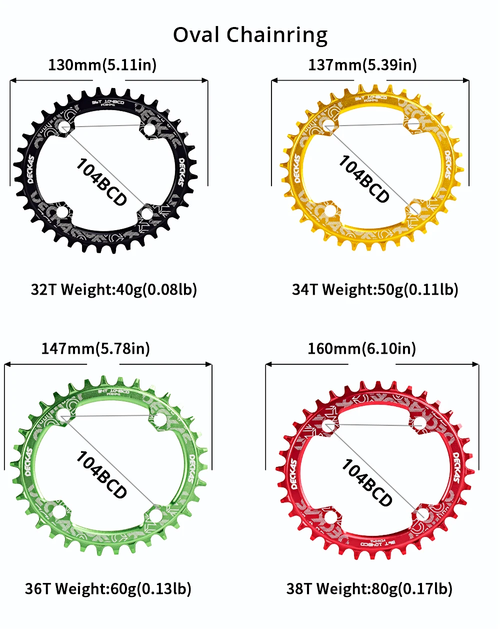 Weight: 32T(38g/0.08lb), 34T(47g/0.1lb), 36T(59g/0.13lb), 38T(69g/0.15lb)