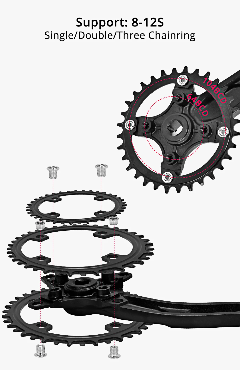 The crank supports positive and negative teeth single disc and 44-32-22T / 42-32-24T three disc.