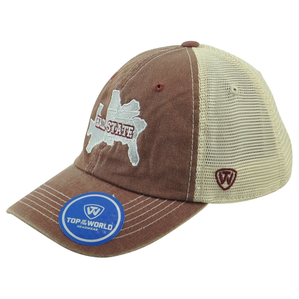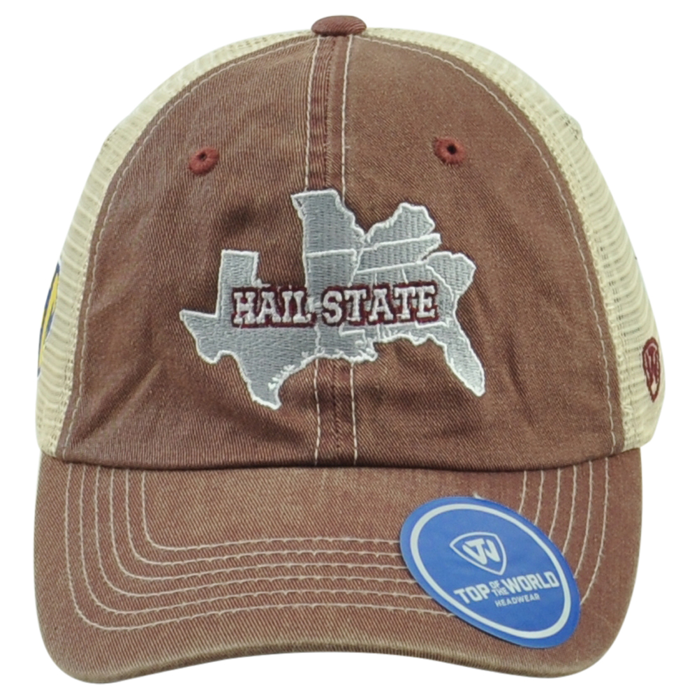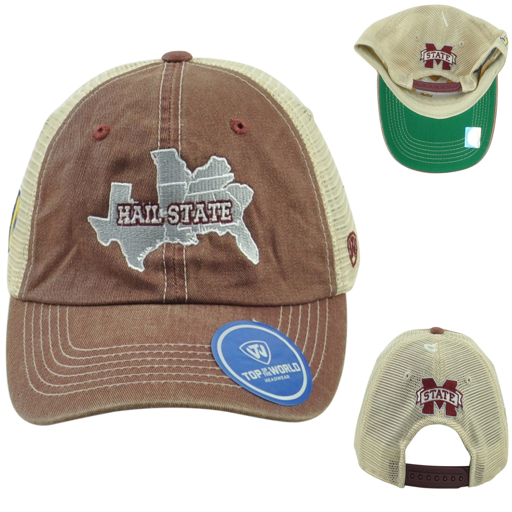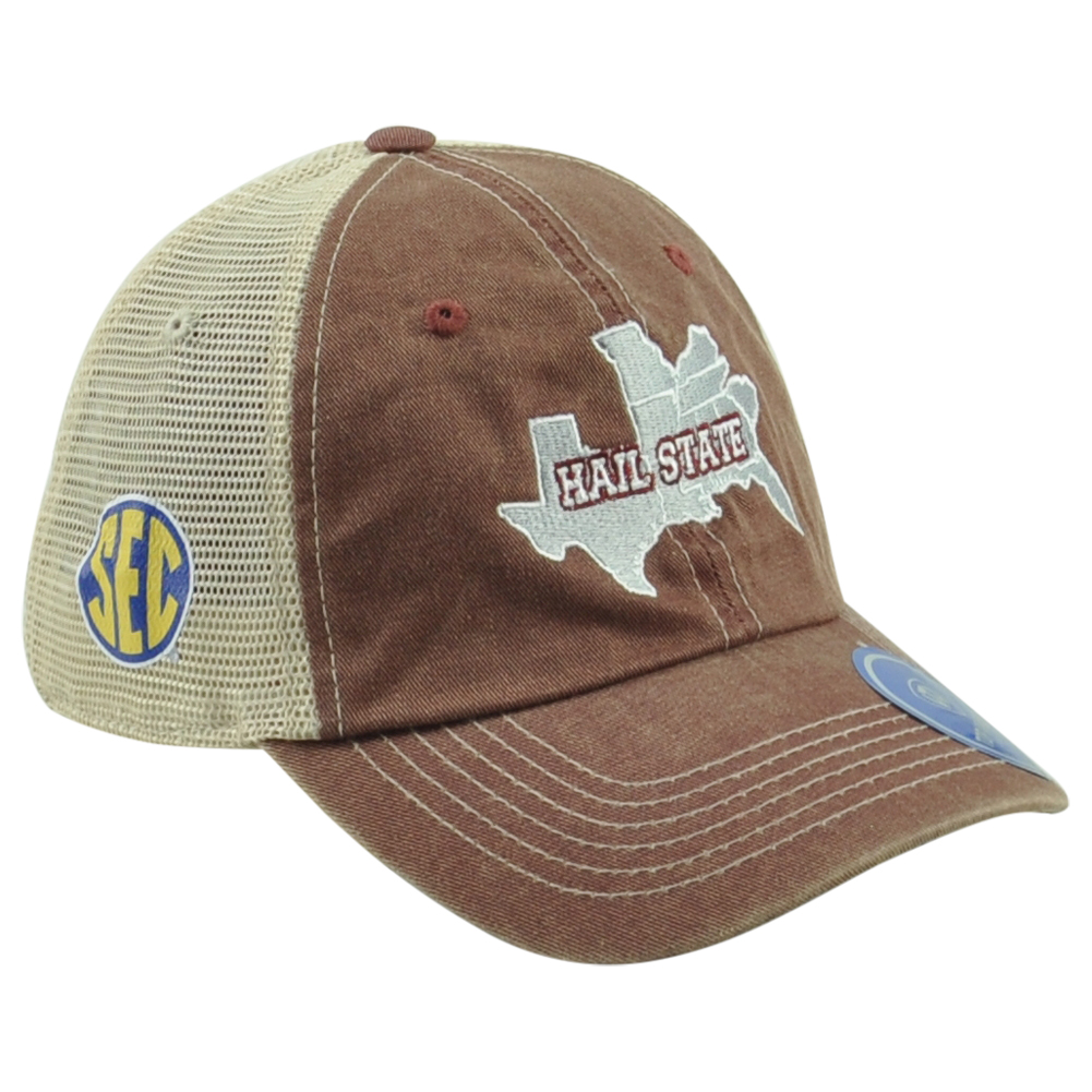 | Description: | Show the love for your team with this Operation hat trick cap. This Top of the World hat features embroidered "Hail State" laid over the states that create the Southeastern Conference (SEC). SEC logo embroidered on the side panel. Top of the World embroidered on the other side of the panel. Team logo embroidered on the back panel. Adults unstructured hat. Curved Bill. This hat features adjustable snapback closure. Material 100% Polyester, 100% Cotton. Mesh on the back panel. Color maroon and beige. Authentic Merchandise. Officially Licensed Product. Brand new item with tags. |