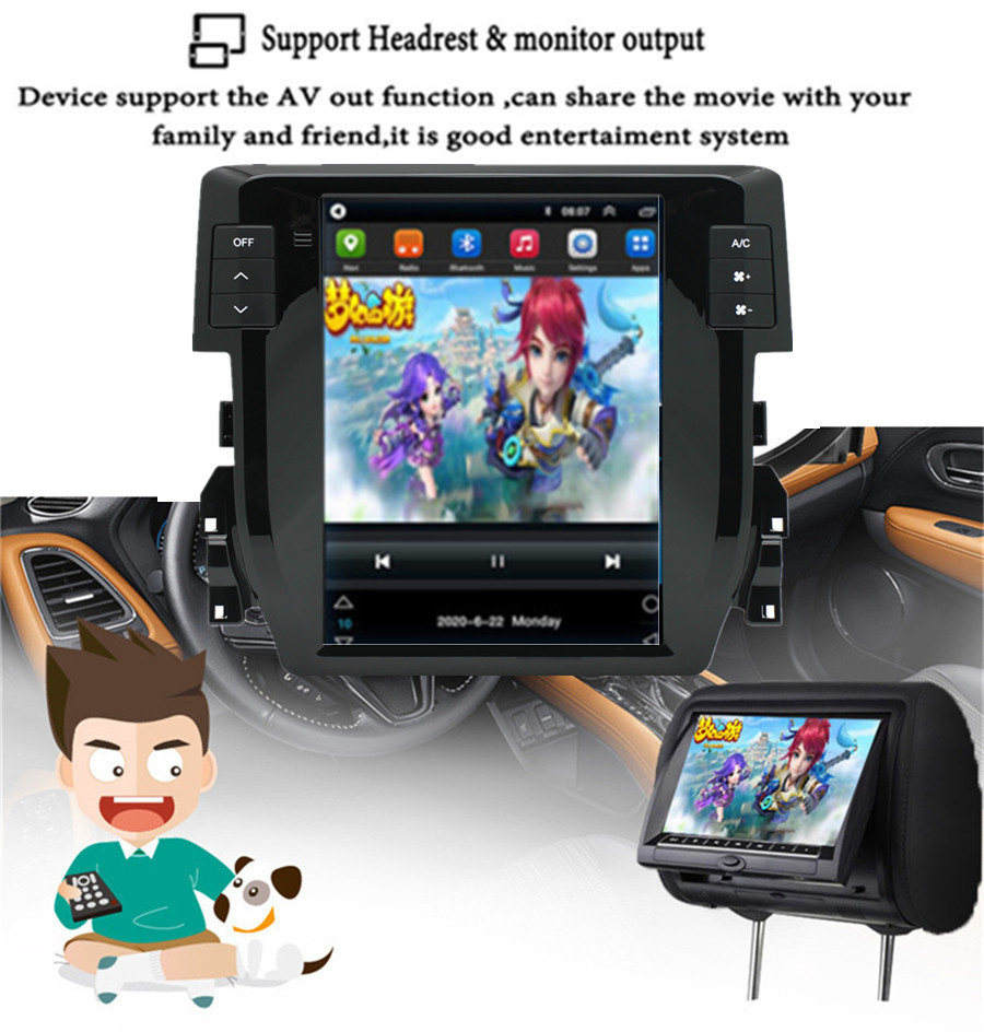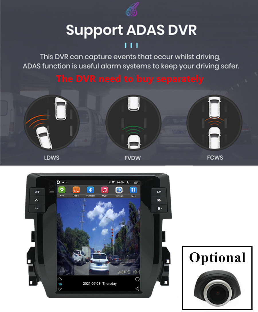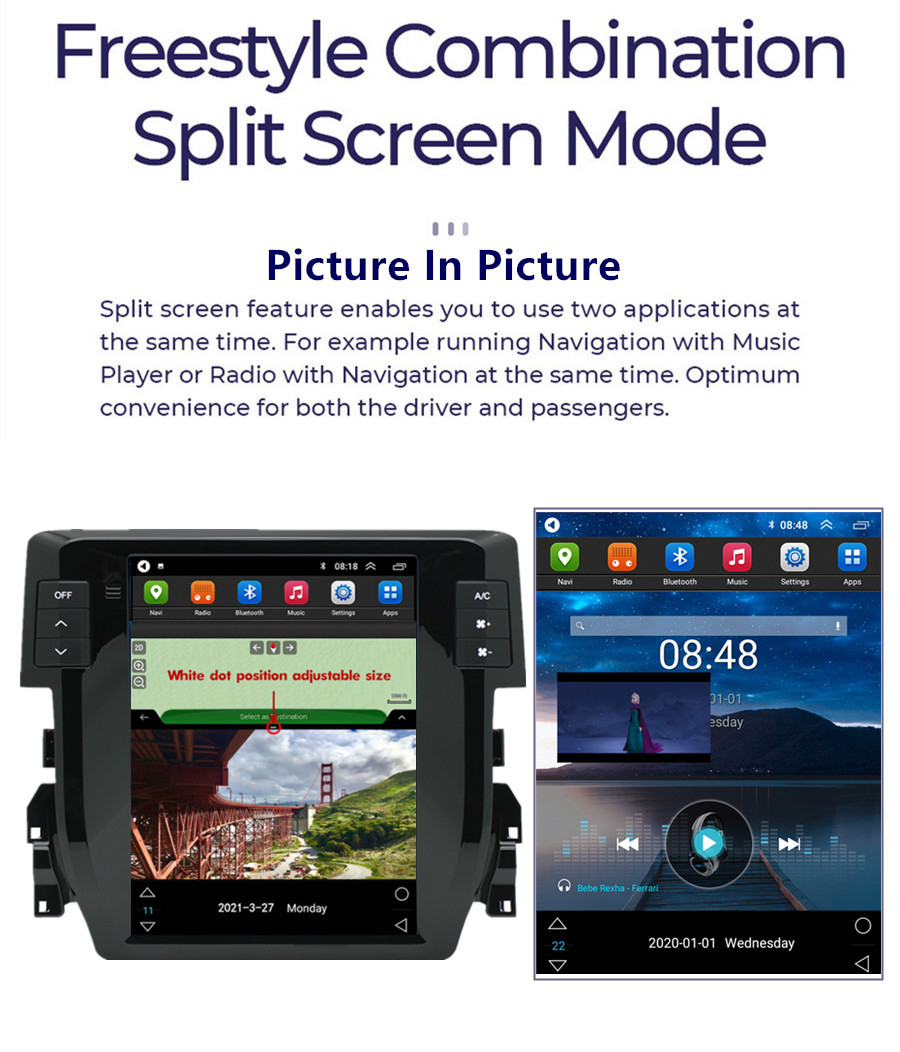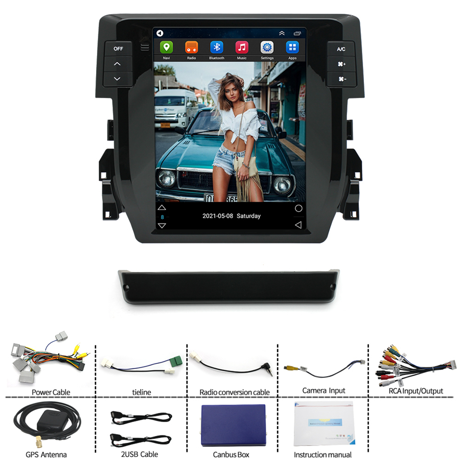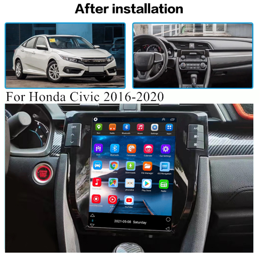 Not fit for cars with factory amplifier - Screen Size: 9.7 inch - Front panel Size: As picture show - -For Honda Civic 2016-2020 - CPU: Quad Core - GPU: Quad Core - ROM: 16GB - Resolution: 1024*768 - Capacitive or Resistance Screen: Capacitive - Change Apps-Icon Position: Yes - Spilt Screen: Yes Split