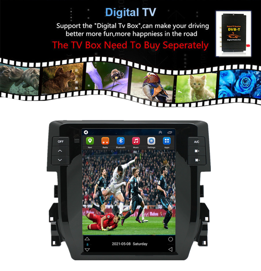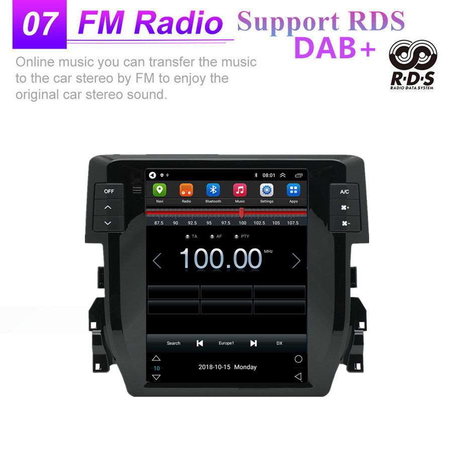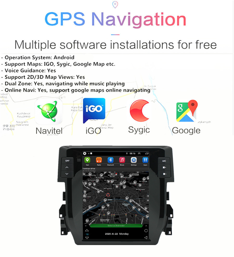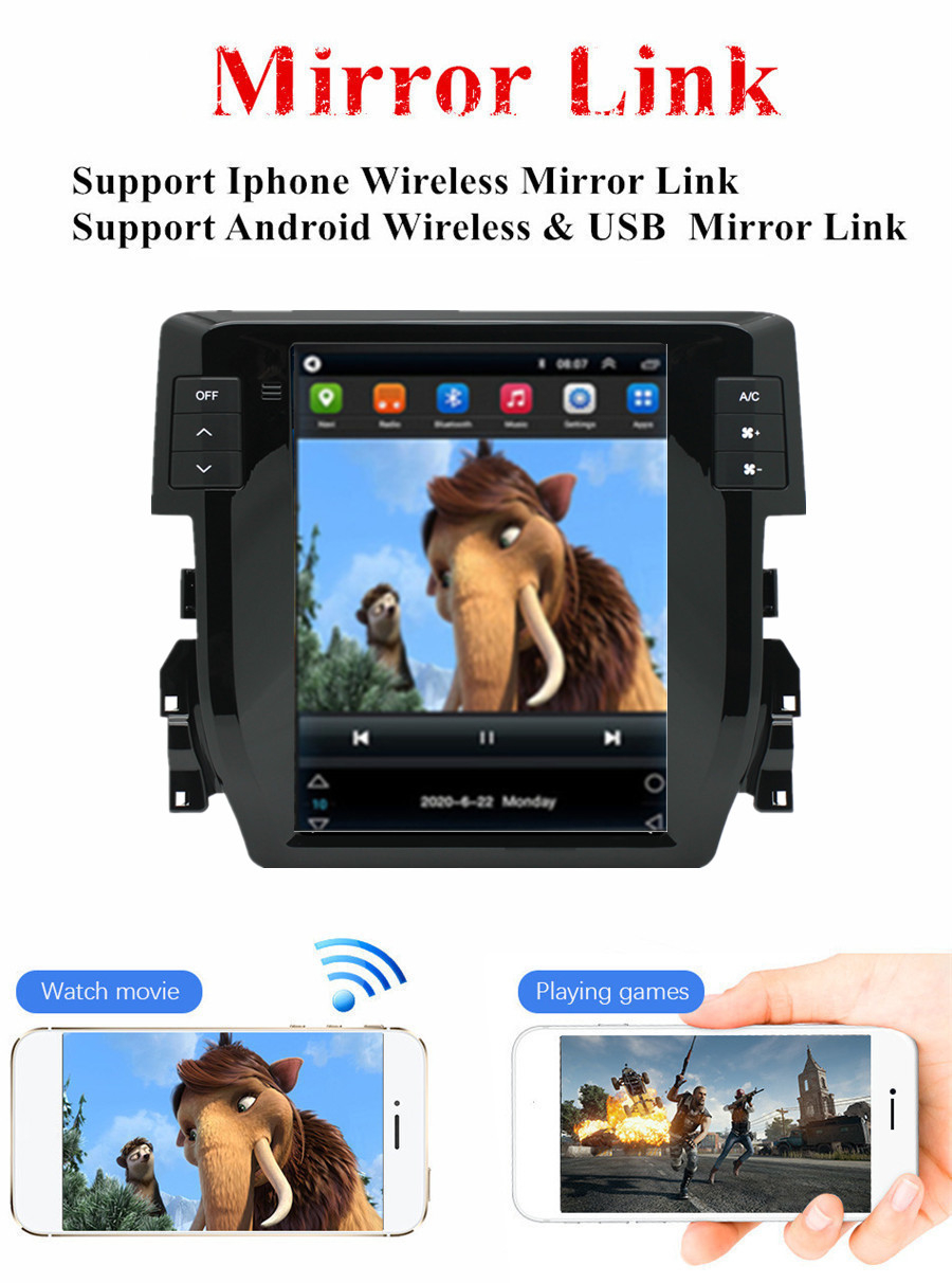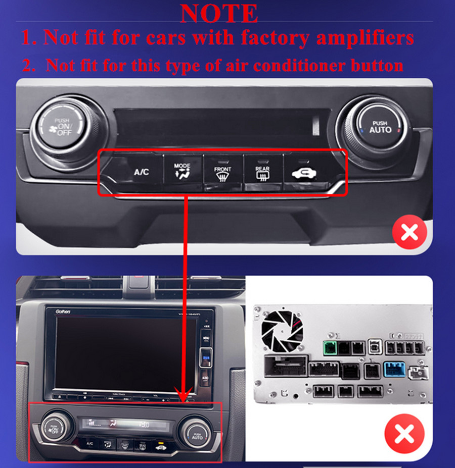 Not fit for cars with factory amplifier - Screen Size: 9.7 inch - Front panel Size: As picture show - -For Honda Civic 2016-2020 - CPU: Quad Core - GPU: Quad Core - ROM: 16GB - Resolution: 1024*768 - Capacitive or Resistance Screen: Capacitive - Change Apps-Icon Position: Yes - Spilt Screen: Yes Split
