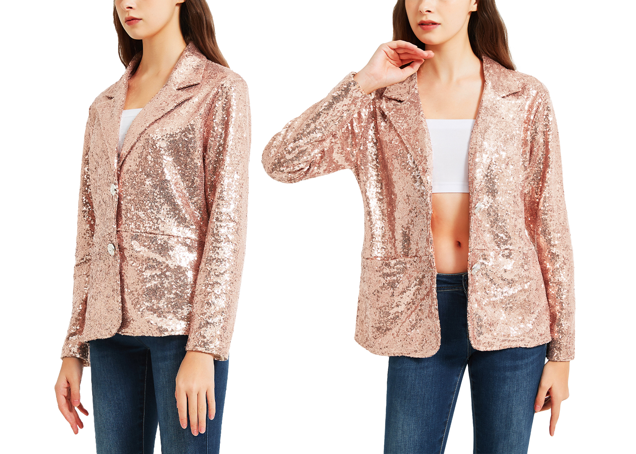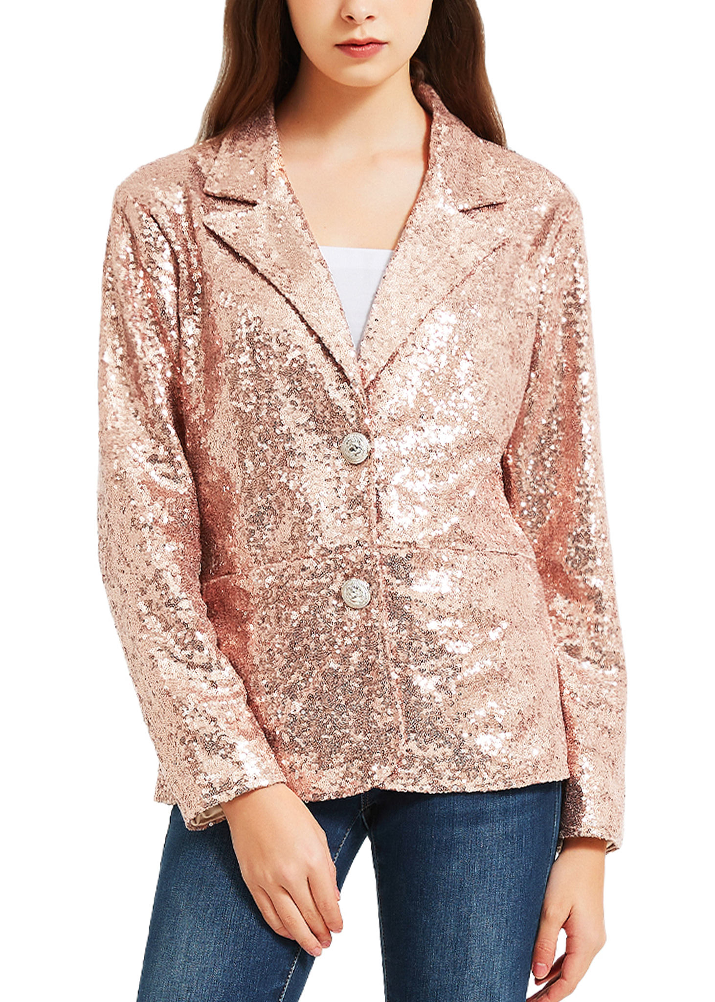 FEATURE - This blazer is designed with sequins that will make you shine and stand out at any event.Sparkling sequin, lapel collar, long sleeve, v-neckline ,open front with button, fully lined, 2 practical pockets, hits at hips length.