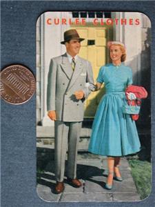 Check it out...Here's an unusual 2 1/4" tall by 3 1/2" wide colorful credit card sized pocket / wallet calendar from a Curlee Clothing store known as "Seybrecht's Men's Wear" in Pottsville, Pennsylvania back in 1953-The colorful card features a well-dressed image of a smiling man & woman with name: "Curlee Clothes" on front and the back has a 1953 monthly calendar inset and the "Seybrecht's Men's Wear. Style. Fit.Quality." on back-What a great dated item for display-This is an ORIGINAL item, NOT A REPRODUCTION item! Postage information is listed at the bottom-$ 4.95 postage is required.