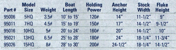 Tie Down 95026 Hooker Economy Anchor Lightweight design ,break in flukes which more than double fluke strength Slip ring permits easy retrieve in fouled, snag-filled bottoms All sizes hot dip galvanized Model 15HQ Anchor Length 24 1/2" Stock width 18 1/4" Fluke Height 14 1/2" Weight 8 lbs Boat Length 28` to 30` |