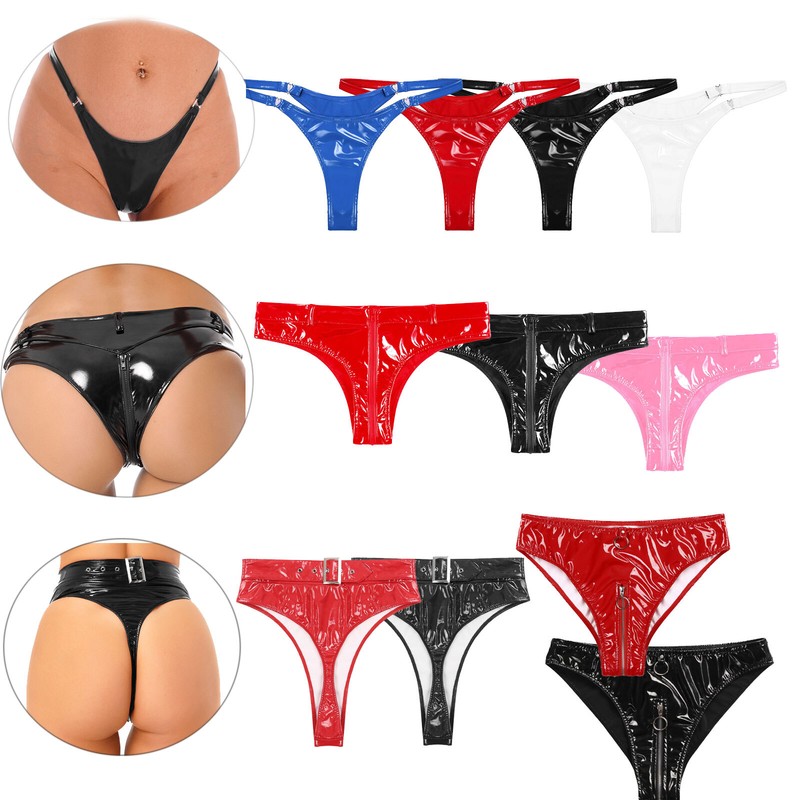 Womens O Ring Zipper Crotch Low Waist Briefs Wet Look Patent Leather Panties.