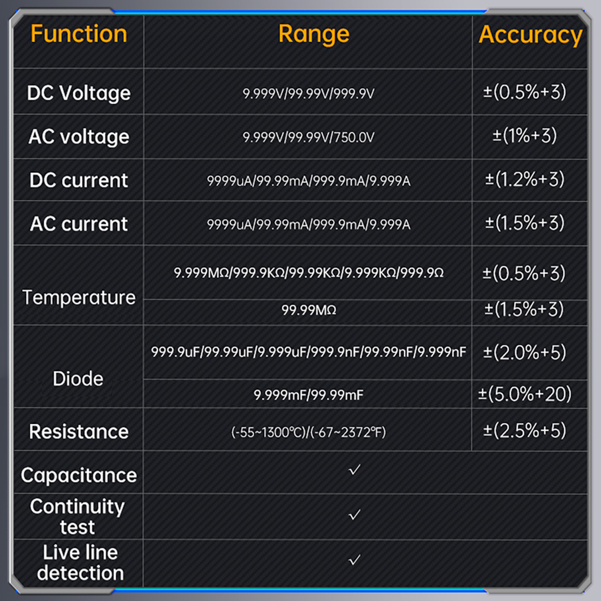 【Multimeter Mode】4-digit 10000 Counts. AC Voltage: 0-750V, DC Voltage: 0-999.9V, DC/AC Current: 0-9.999A, Resistance: 0-99.99MΩ, Capacitance: 0-99.99mF, Temperature: -55°C-1300°C/-67~2372℉, Diode, Continuity Measurement. An ideal multi-function meter for professionals, factories, schools, hobbyists or home use.