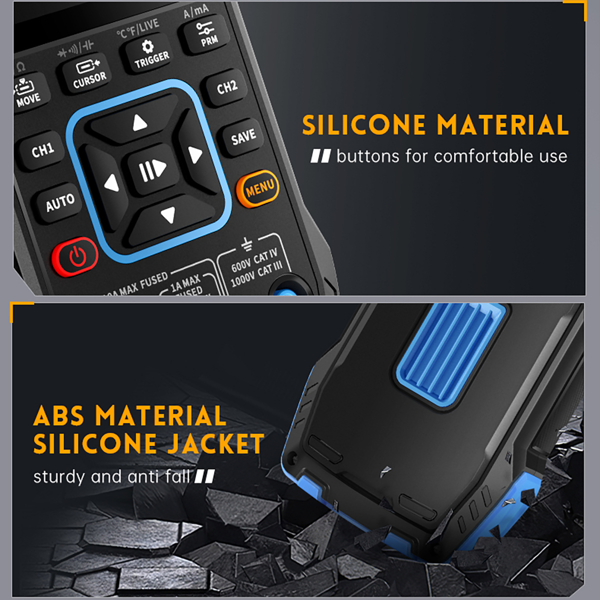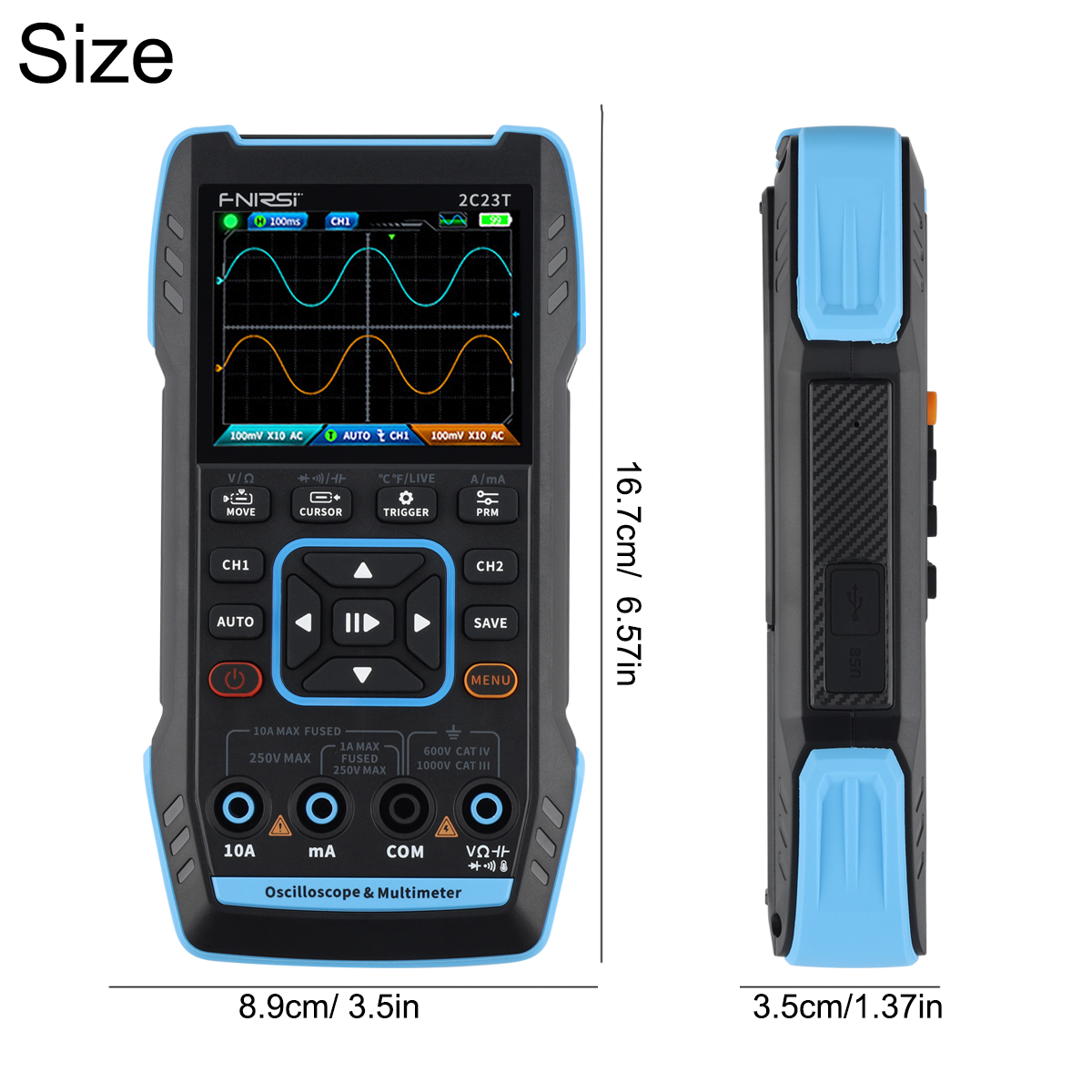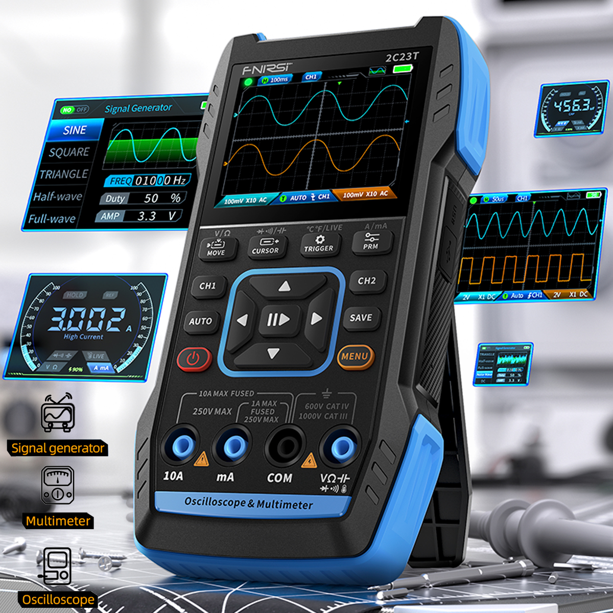 Main functions: Oscilloscope, signal generator, digital multimeter.