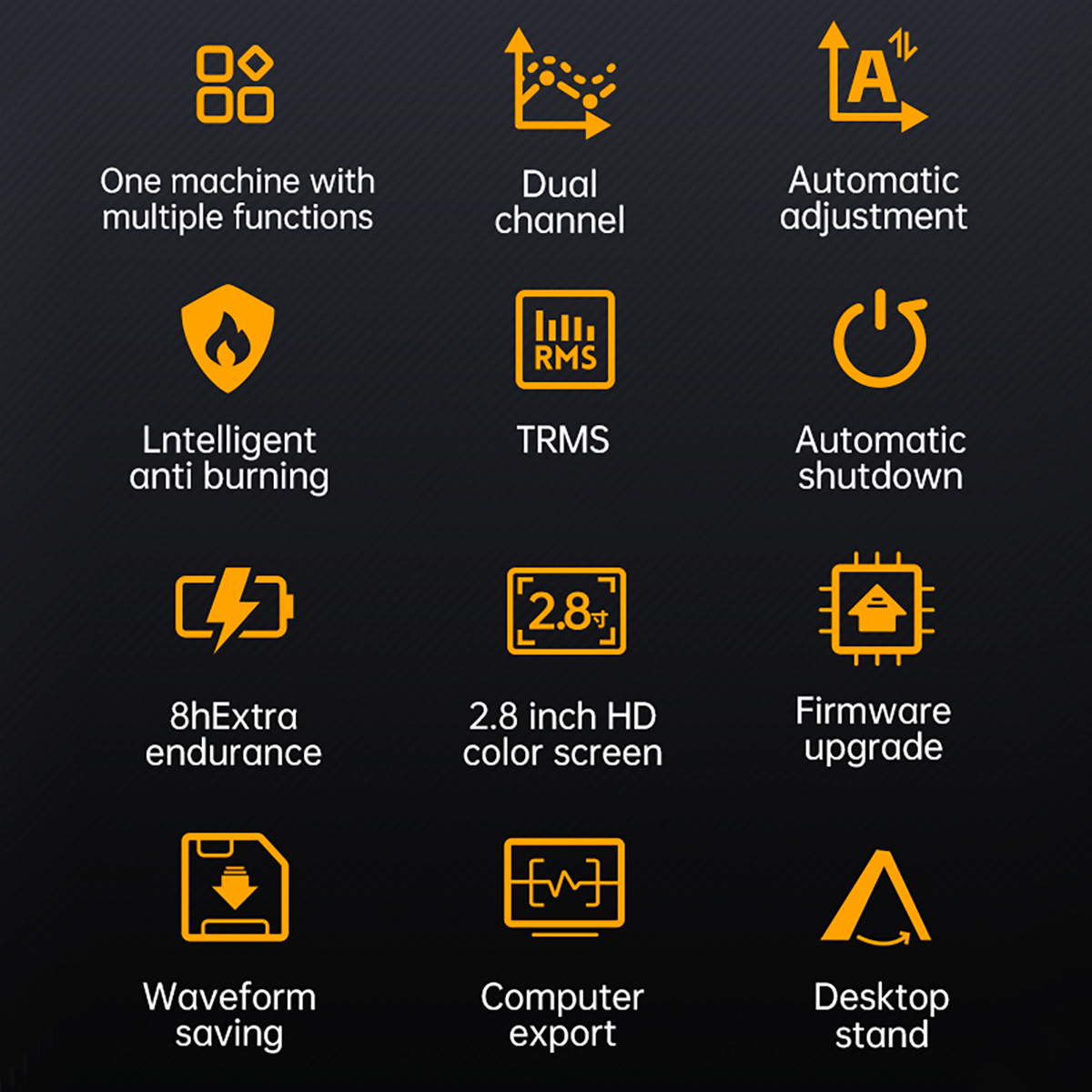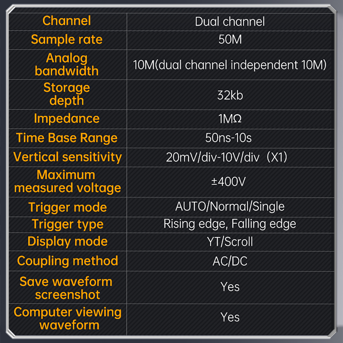 【Oscilloscope Mode】2 channel handheld oscilloscope, 10MHz bandwidth, real-time sampling rate 50MSa/s, record depth 32kb, maximum measurement voltage ±400V, automatic measurement function, trigger function auto/normal/single, 200mv/div-10v/div vertical sensitivity, support waveform image storage and export.