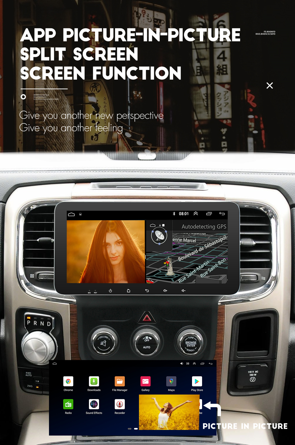 Display | - Touch Screen: Yes - Resolution: 1600*720 - Capacitive or Resistance Screen: Capacitive - Built-in Clock and Calendar: Yes, show real time and can use network-provided time - Main Menu Status Bar display: Can be changed to Music/Radio/BT-Stereo Player and Clock/Date/Week - Change Apps-Icon Position: Yes - Picture in picture split screen:Yes Split screen feature enables you to use two applications at the same time. For example running Navigation with Music Player or Radio with Navigation at the same time. Optimum convenience for both the driver and passengers. |
