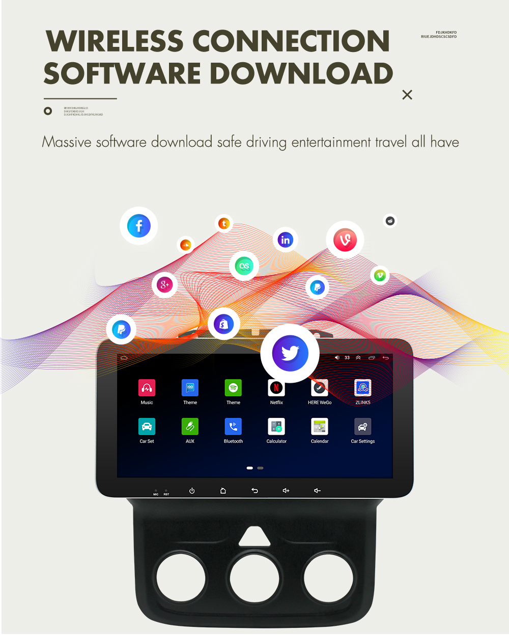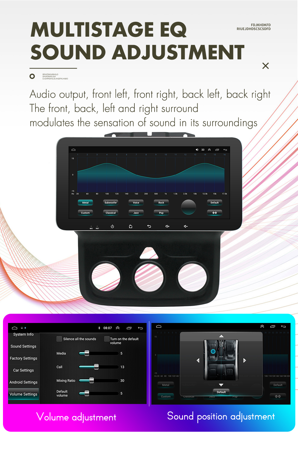 Setup | - WiFi/Hotspot/Bluetooth: Yes - Brightness level adjustable: Yes - Wallpaper: Wallpapers/Live Wallpapers/Gallery - Sound: Key Tone & Volume - Storage: Display Internal Storage/Nand Flash/Connected Device Storage - Apps: Running Apps display/force stop/uninstall - Security: Yes - Accounts: Yes - Languages and Input: more than 70 Languages and choose input method - Backup and Reset: Yes - Date and Time: Setting Date&Time by yourself or choose GPS/network-provided time - Accessibility: Yes - GPS: Yes, GPS application options/monitoring/sound mode/mixing ratio - Driving safety: Watching Video, Reversing X-mirror/Volume, Reversing Trajectory/radar Display, Rear view ruler - Amplifier: Rock/Pop/Jazz/Classic/Flat/Voice/Custom - Steering Wheel Control: Yes - About Device: Display Parameter Info. |