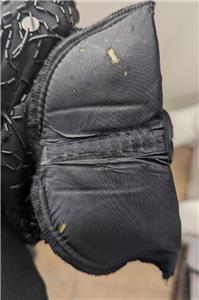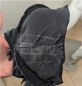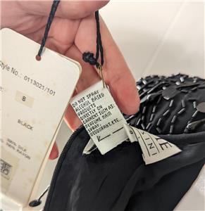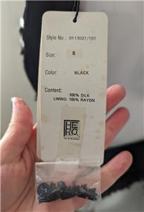 Condition: New with tags. The tags were originally attached with a small safety pin to the left cuff, where they made a tiny hole. I moved them to the tag so the damage would not become worse. The shoulder pads have residue from the foam disintegrating from the covered hanger and one has a couple little holes from hanging.