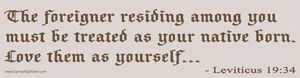 The foreigner residing among you must be treated as your native born. Love them as yourself ... Bumper Sticker or Magnetic Bumper Sticker