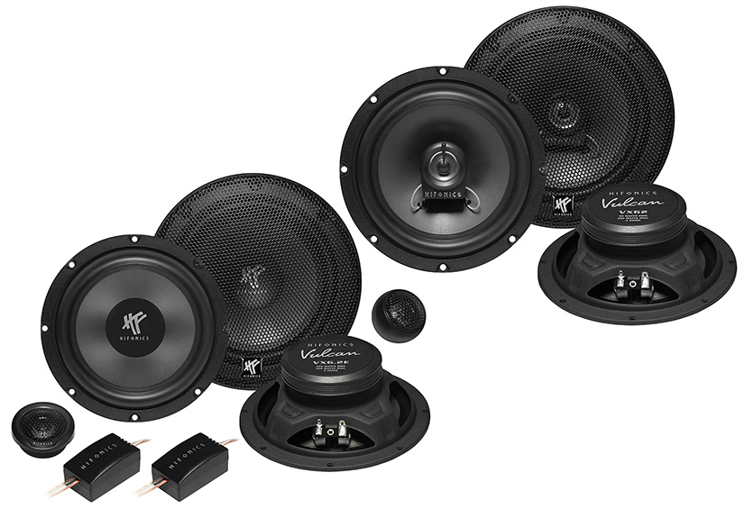 1 x Hifonics VX6.2E & VX62 (Bestehend aus 2 Stk. Koaxial-, 2 Stk. Hochton-, 2 Stk. Tiefton-Lautsprecher, 2 Stk. Weichen (integriert/Extern)) 1x Fahrzeugspezifisches Einbauset für Front/Heck (Siehe Bilder)