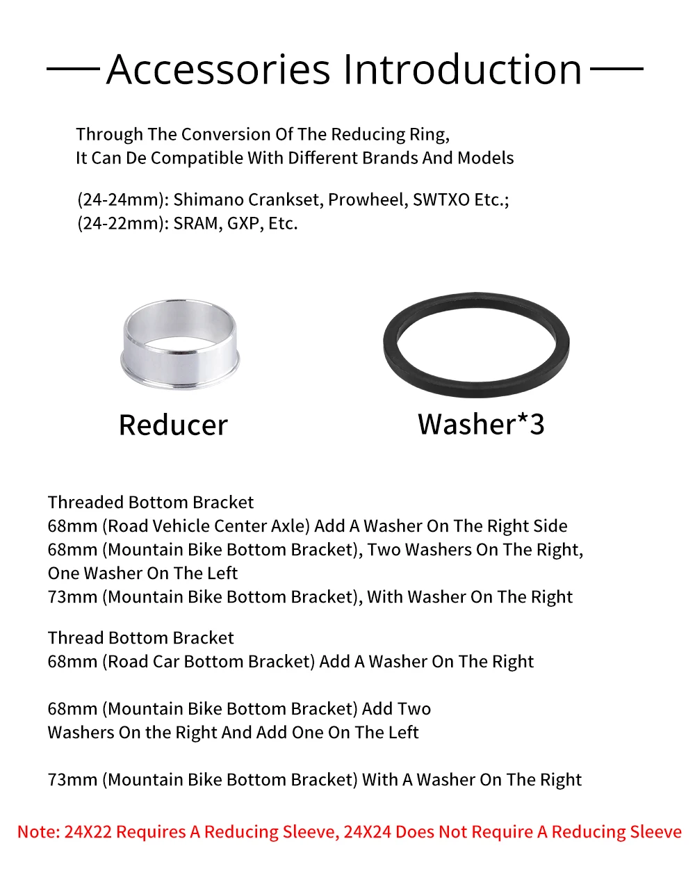 Fit for :Shimano full range of cranksets,SRAM GXP road bike or MTB crankset,Rotor 3D24,Aldhu24 crankset and other brand of crankset with shaft diameter 24mm.