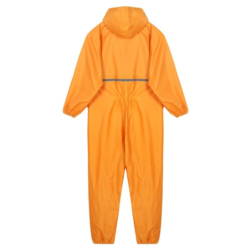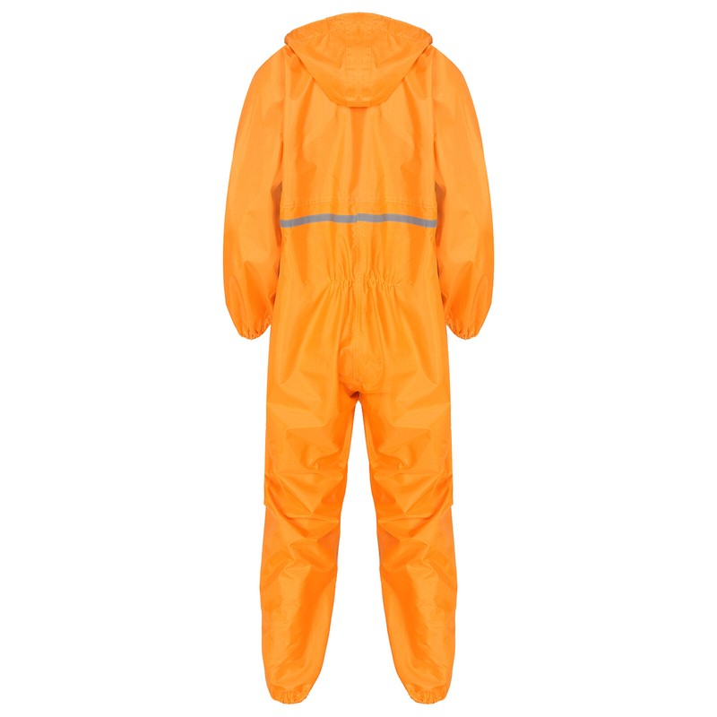 The jumpsuit with high visibility reflective strip on the front and back keeps you safe on rainy days.
