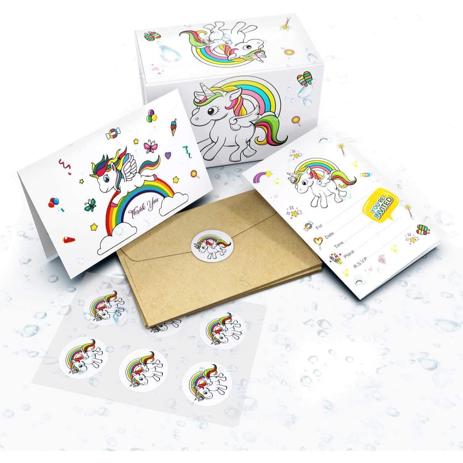 Unicorns 24 Invite Cards, 24 Thank You Cards, Bonus 24 Tattoos, and 48 Envelopes